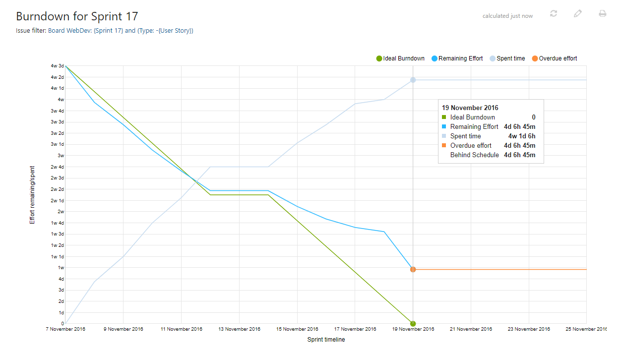 Spent time | Shows the cumulative amount of spent time for each day. This value is calculated based on the amount of spent time that is added to issues in work items. The burndown chart only calculates spent time that is added as work items to the issues that are shown on the report. If you set up an agile board for epics as described in Agile Boards for Epics, the burndown chart for user stories doesn't show spent time. This is because the spent time for each user story is calculated based on the work items added to its underlying tasks. The user stories themselves don't have any work items. If you want to show spent time on a burndown chart for parent tasks, you need to add your work items to these issues instead of using time tracking for subtasks. You can add work items to both parent tasks and subtasks, but the spent time calculation for parent tasks is inflated. |