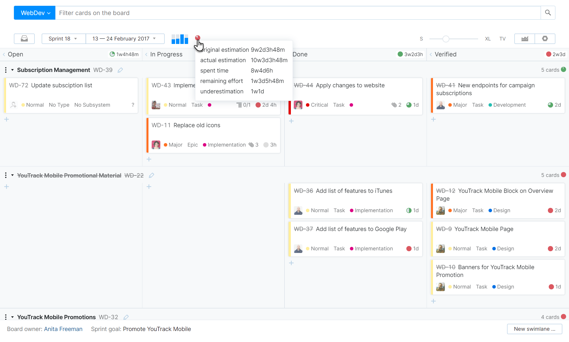 For issues that are linked as the parent for other issues, YouTrack automatically calculates the estimation and spent time as the sum of values that are added to each subtask. If you created a project with the Scrum Project Template, pay careful attention when updating time tracking data. This project template creates two agile boards: one for development and another for project management.