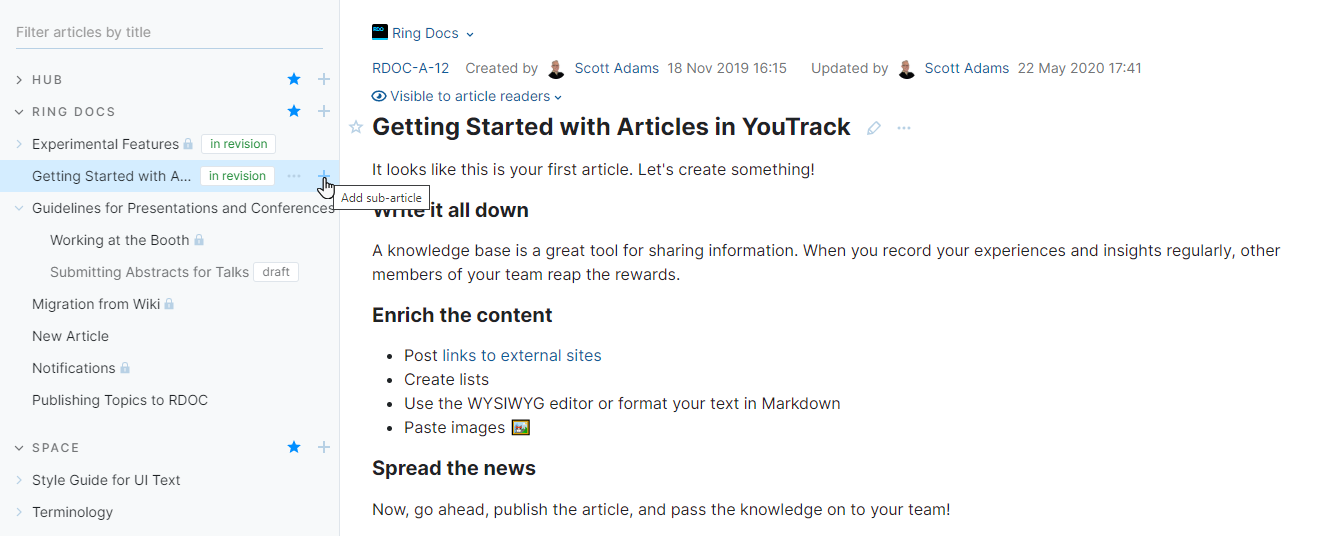 To add sub-articles to an existing article, click the plus icon to the right of the article title.