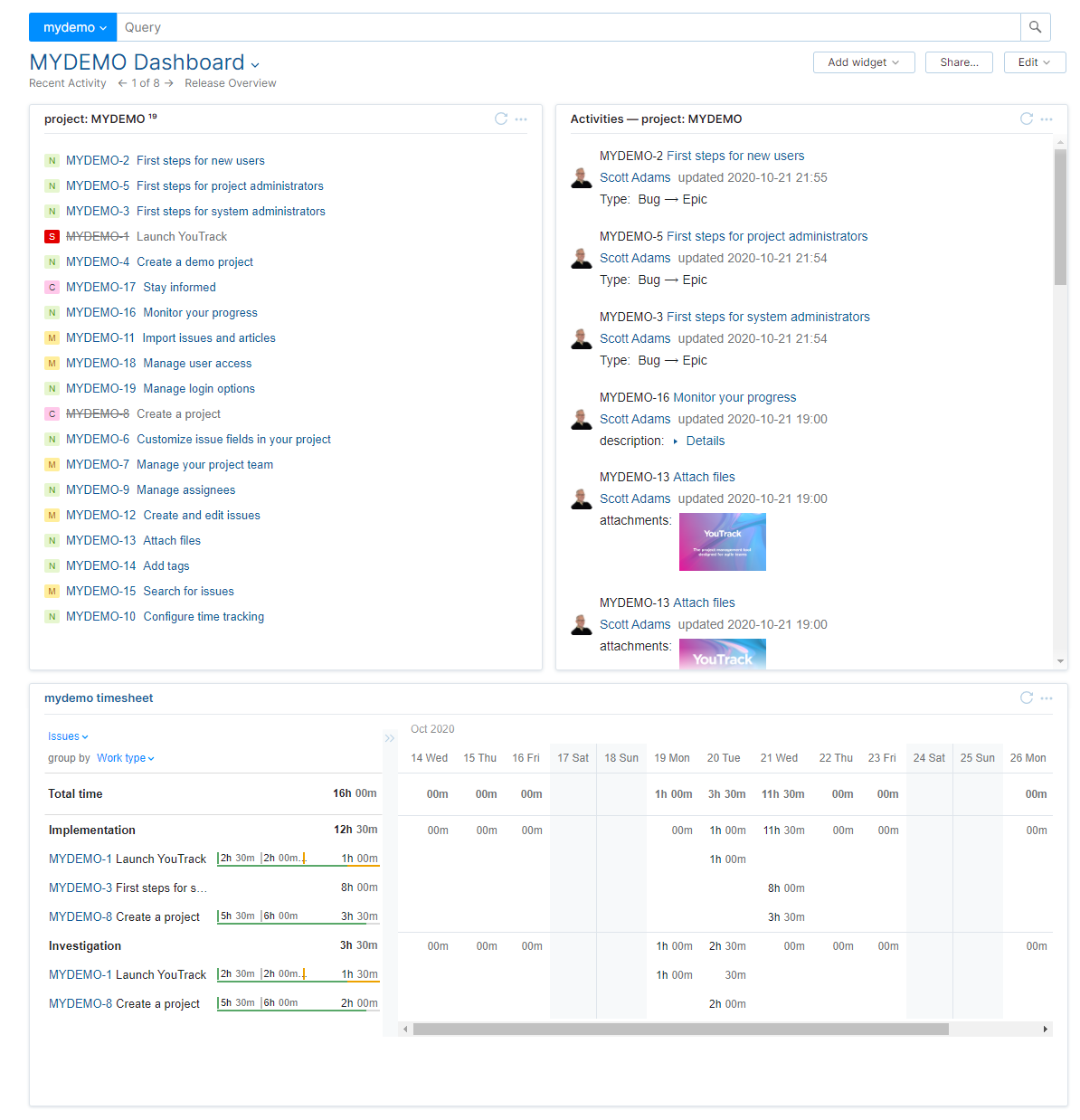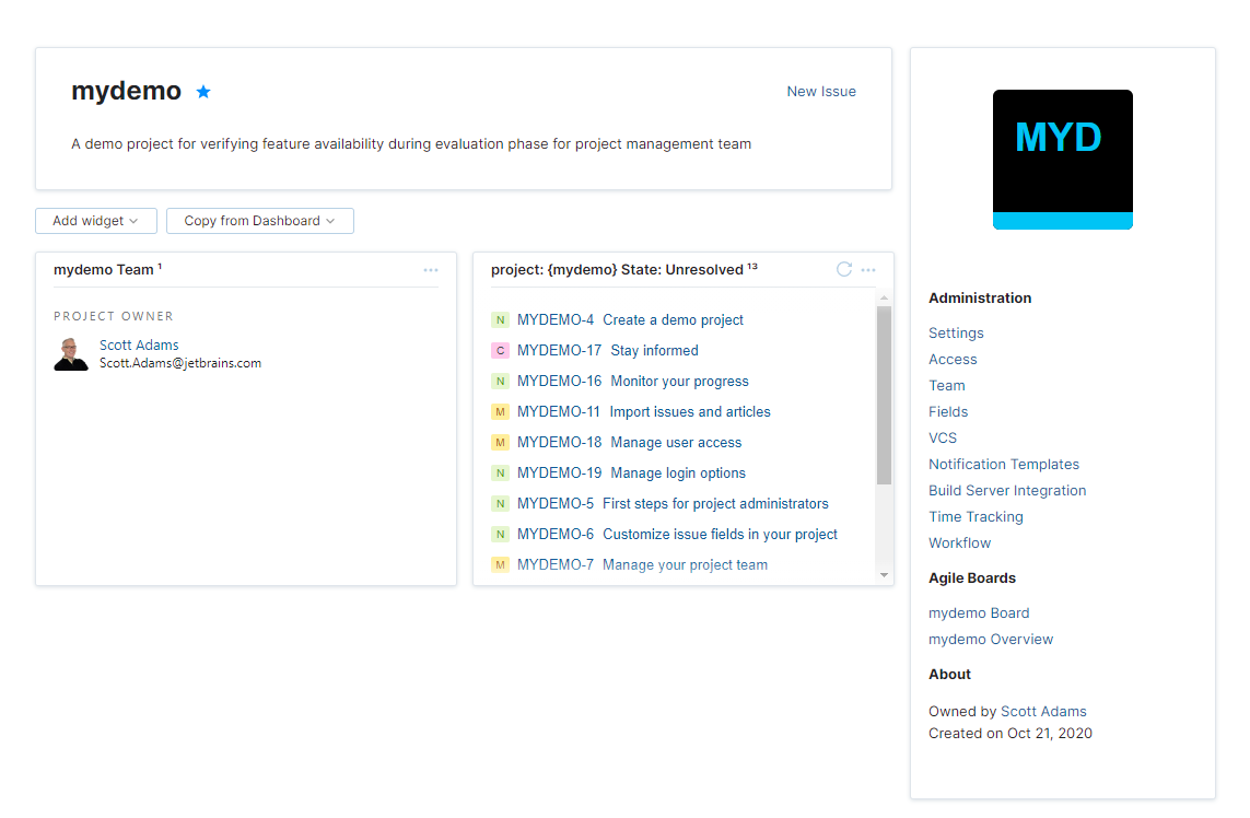 The demo project contains a preconfigured set of sample issues that help you become more familiar with key features in YouTrack. The demo project also includes a collection of agile boards, reports, and a dashboard.