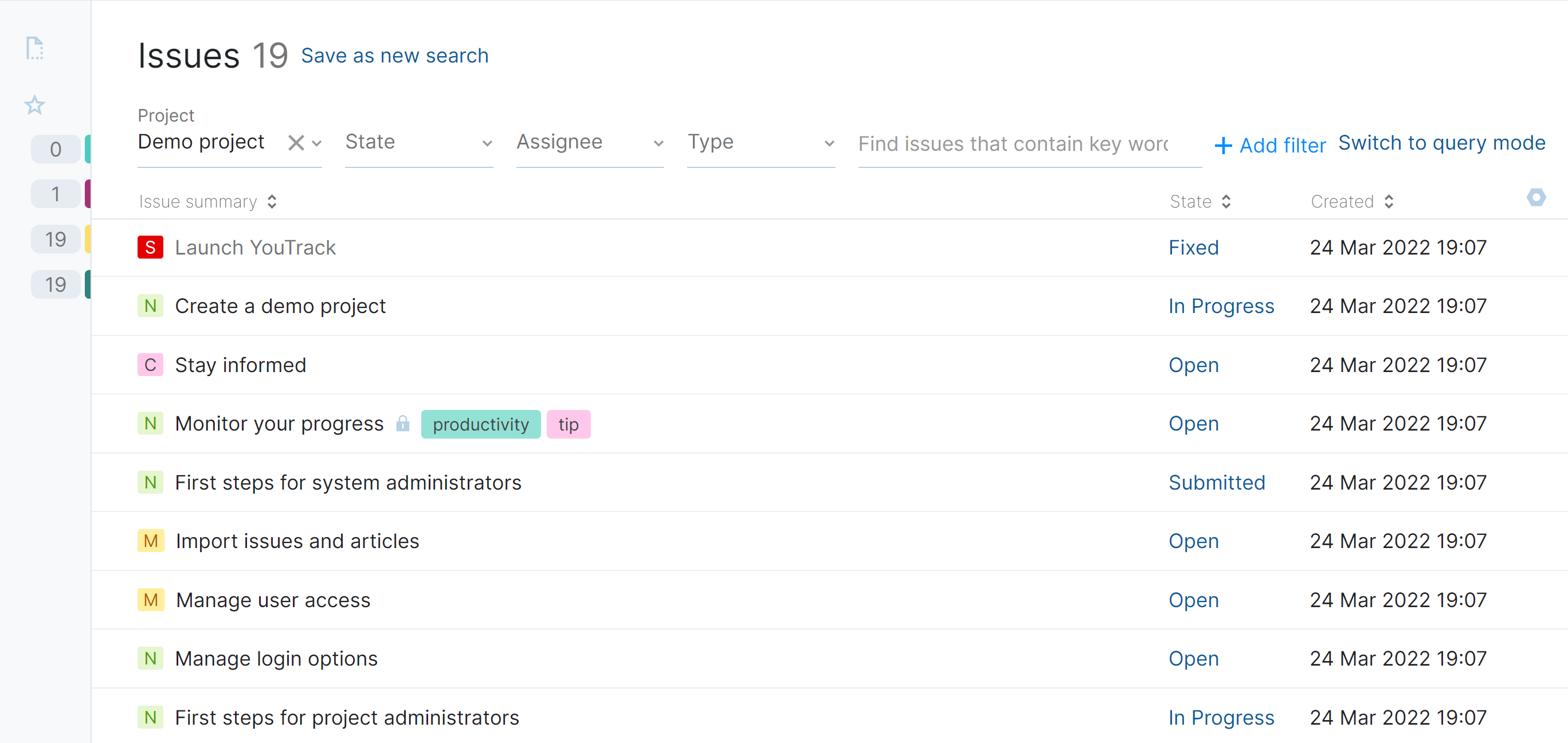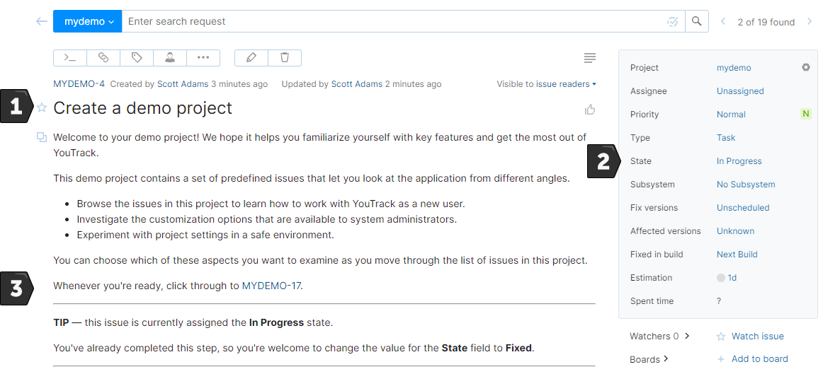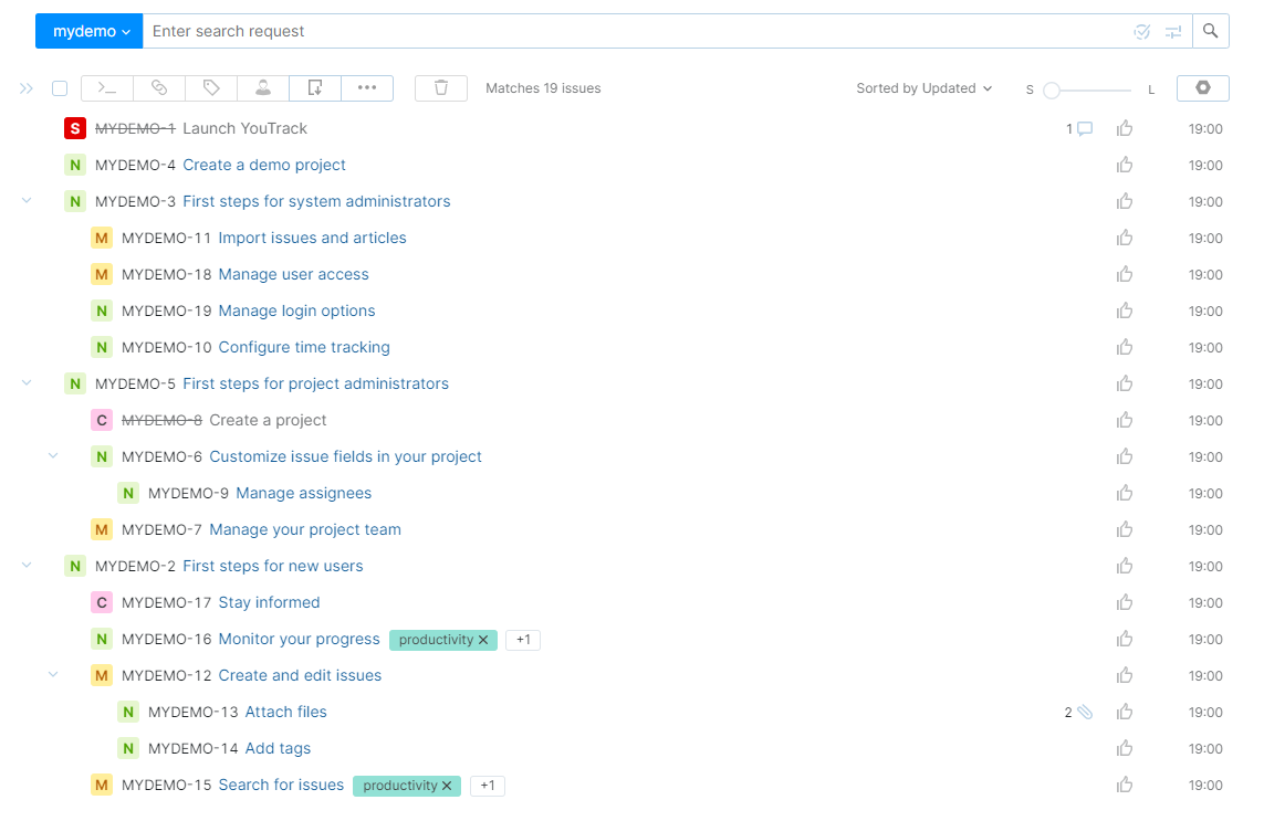 If you're evaluating YouTrack as a potential solution for managing projects in your organization, use the demo project to get first-hand experience with a range of features with minimal downtime for setup and configuration.