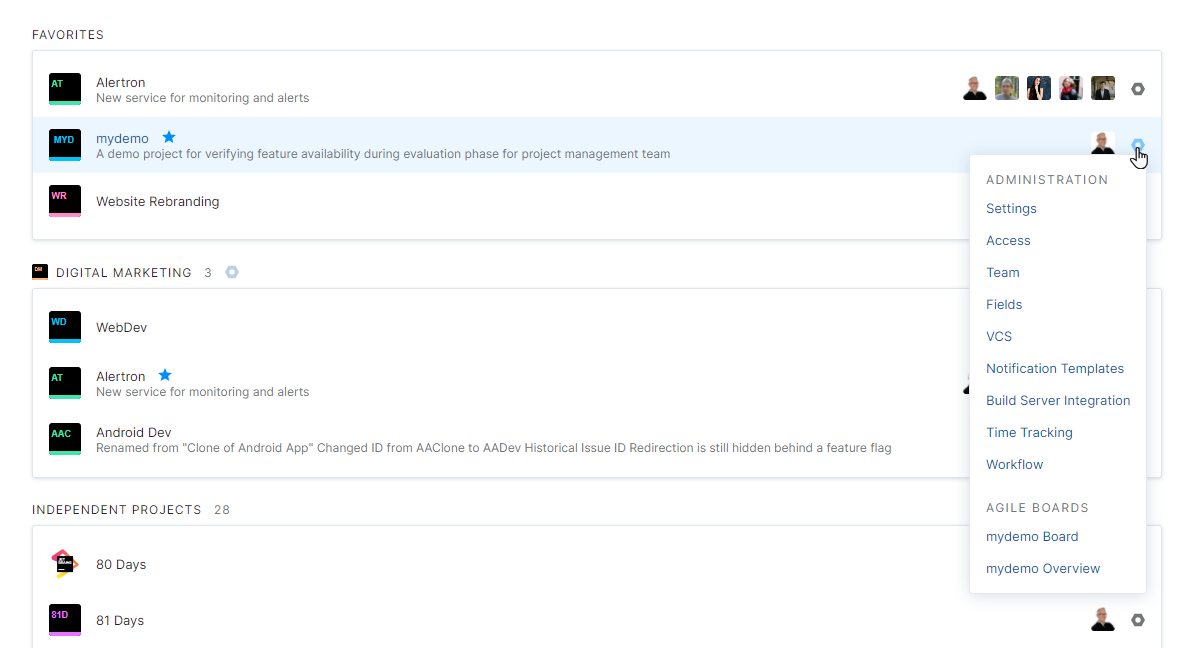 The Settings icon for your demo project lets you navigate to the following locations in YouTrack: