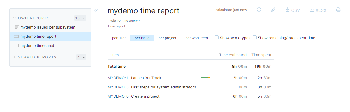 The second report shows how much time has been spent working on various issues in the demo project. This information is based on the amount of spent time that has been added to issues as work items.