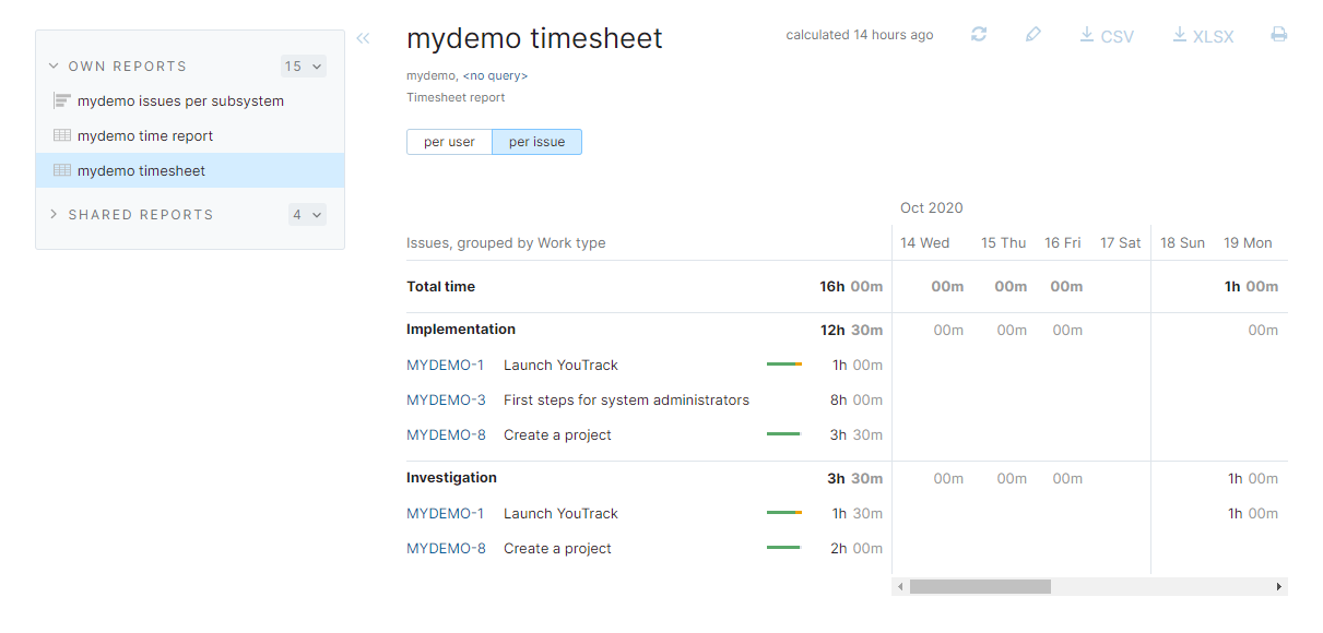 The last report shows the same information that is presented in the Time report, but from a different perspective. On the Timesheet report, the amount of time spent working on issues in the demo project is plotted on a timeline.