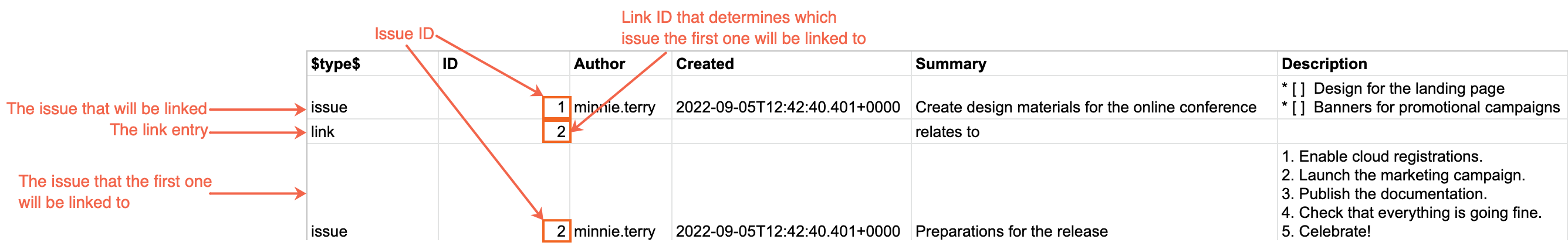 linkYouTrack converts the Summary column contents into the name of the link type. A link of this type will connect the issue above to the issue which ID is set in the