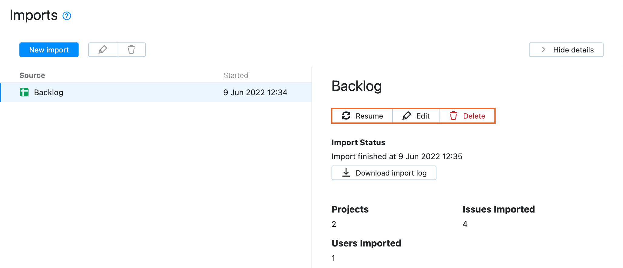 Delete | Deletes the current import settings. Projects and issues that were imported from the connected Google spreadsheet are not affected. If you delete the import settings and connect to the same Google Sheets spreadsheet, the issues are re-imported into existing projects with new issue IDs. |