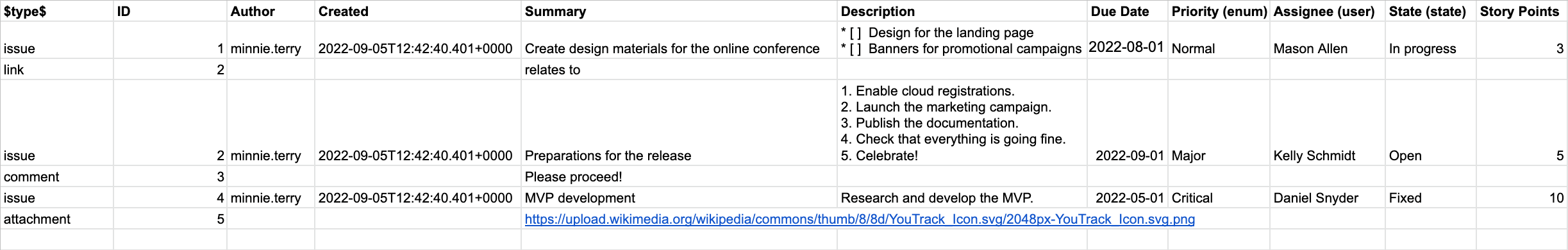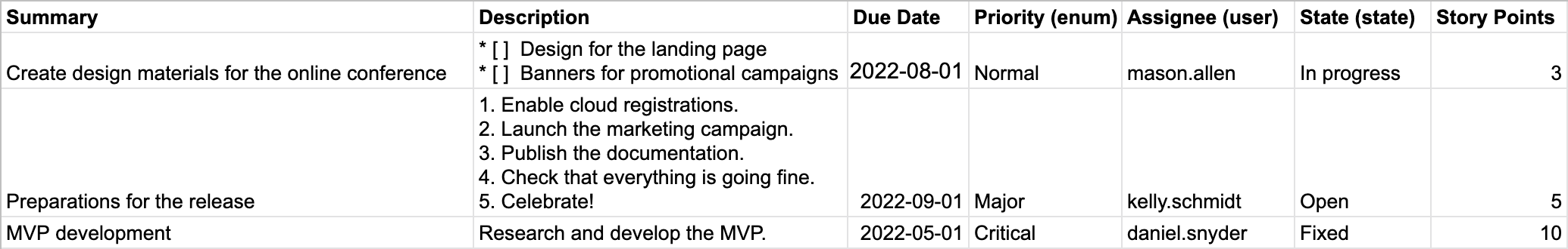 To make sure that YouTrack handles the data from your spreadsheet accurately, preformat the column names and the values as follows.
