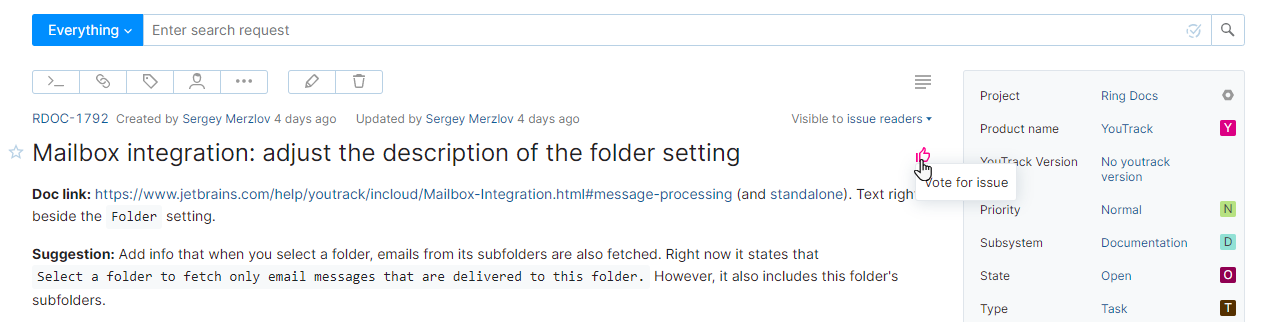The option to receive notifications for @mentions in issue descriptions and comments is also enabled by default in your YouTrack profile.