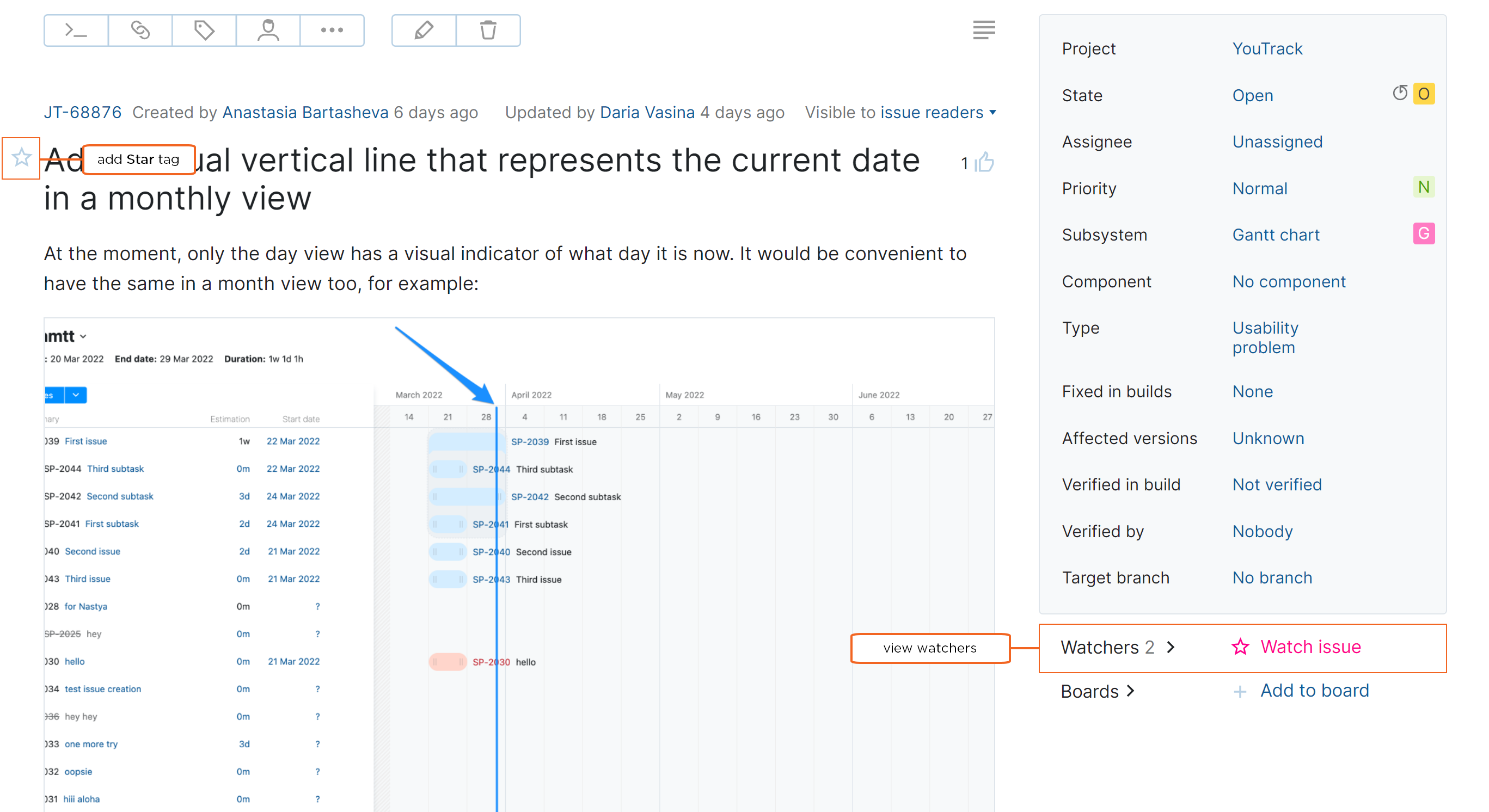 YouTrack lets you set up your own subscriptions so that you only receive notification for events that are important to you. You can subscribe to updates applied to issues that match a saved search or have been labeled with a specific tag.