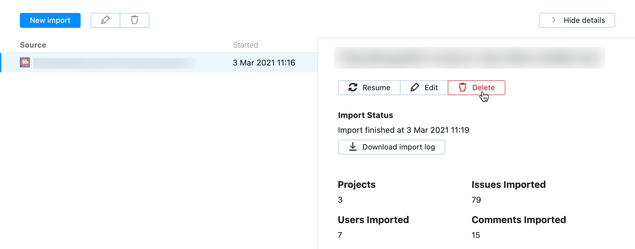 Delete | Deletes the current import settings. Projects, issues, comments, users, and groups that were imported from the connected Bugzilla service are not affected. If you delete the import settings and connect to the same Bugzilla service, the issues are re-imported into existing projects with new issue IDs. |