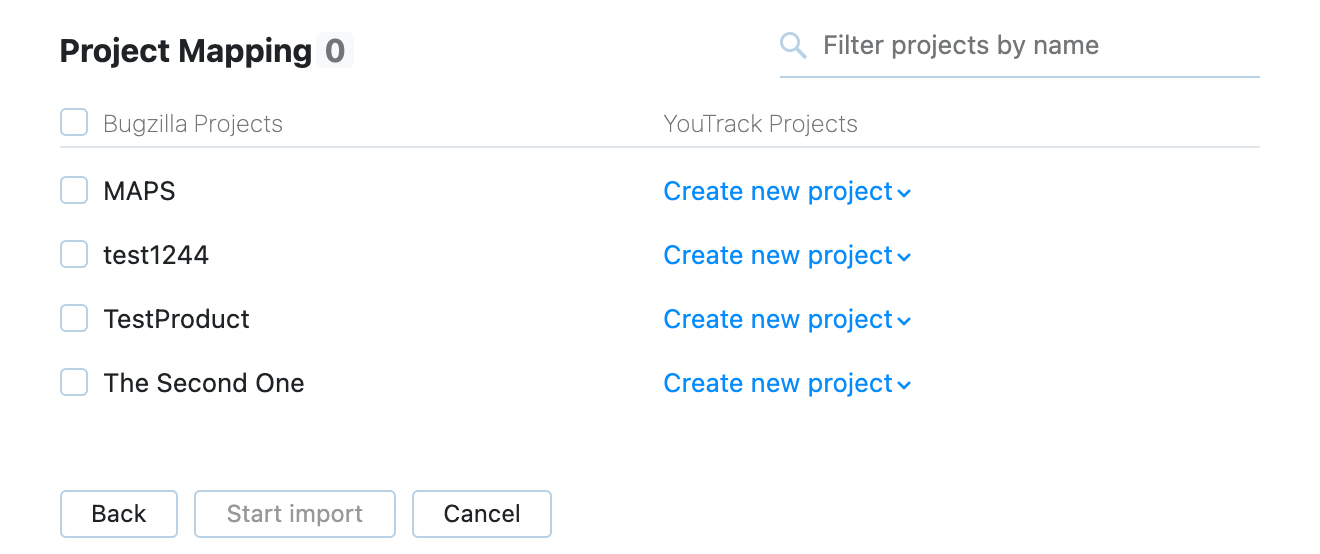 YouTrack will create a project of the same name as the target project in Bugzilla and import found issues, articles, and users.