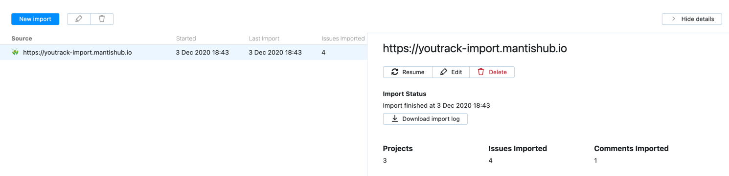 In the details sidebar, YouTrack shows import status, the date and time of the last import, and details on the data that was imported. If there are any problems encountered during import, the error messages are displayed here.