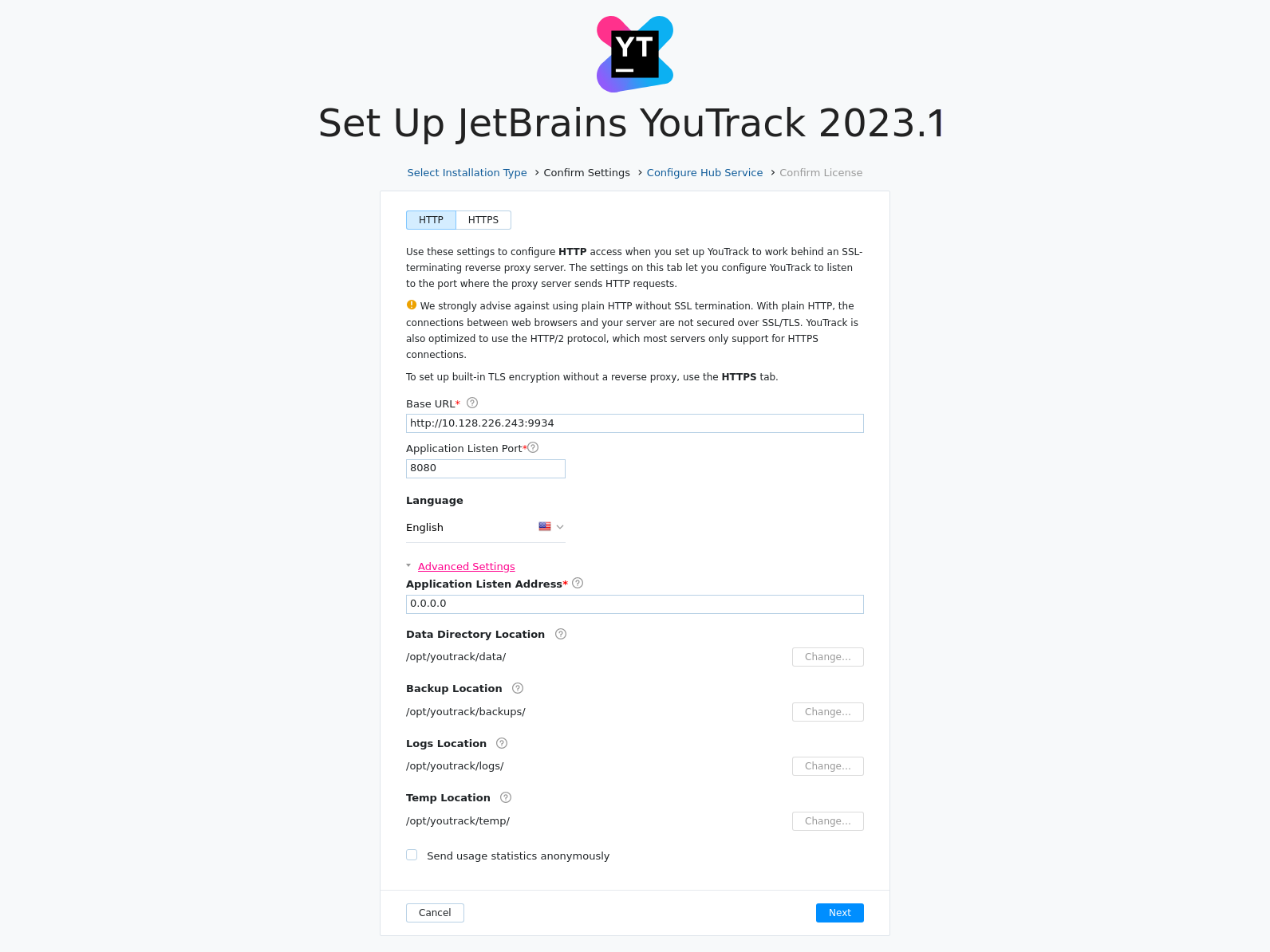 At this point, the application is installed with the default configuration. To ensure that YouTrack is set up properly to work in your server environment, you need to confirm and fine-tune its configuration.