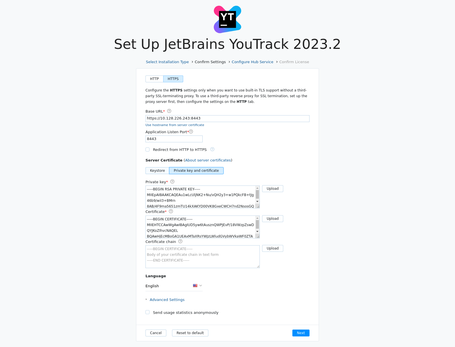 YouTrack_Server_TLS_cert.pemfile.Continue with the standard installation or upgrade. When done, traffic to your YouTrack server is secured using the self-signed certificate.