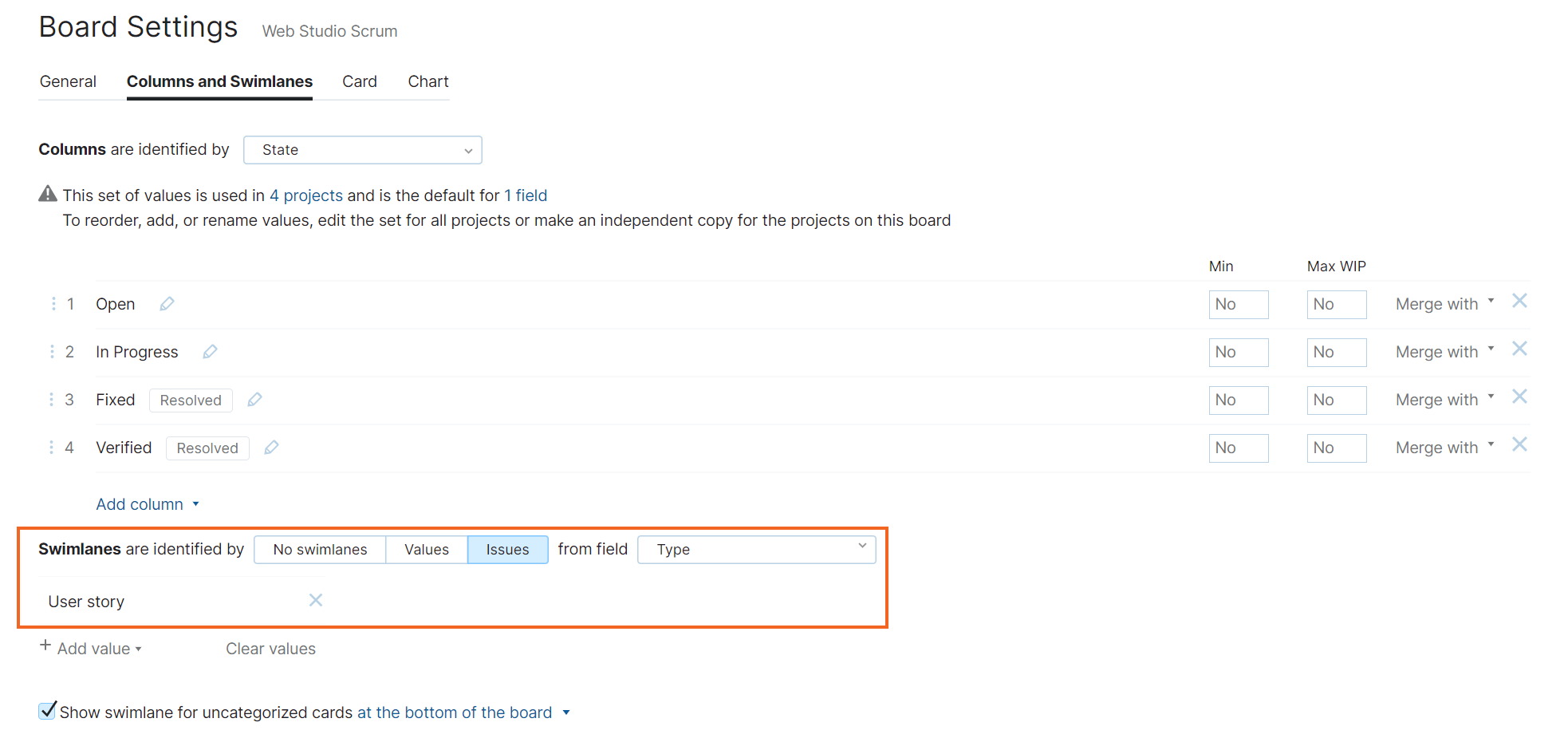 On the Columns and Swimlanes tab, check the Swimlane settings. This setting should already identify swimlanes by issues from the Type field and use User Story.