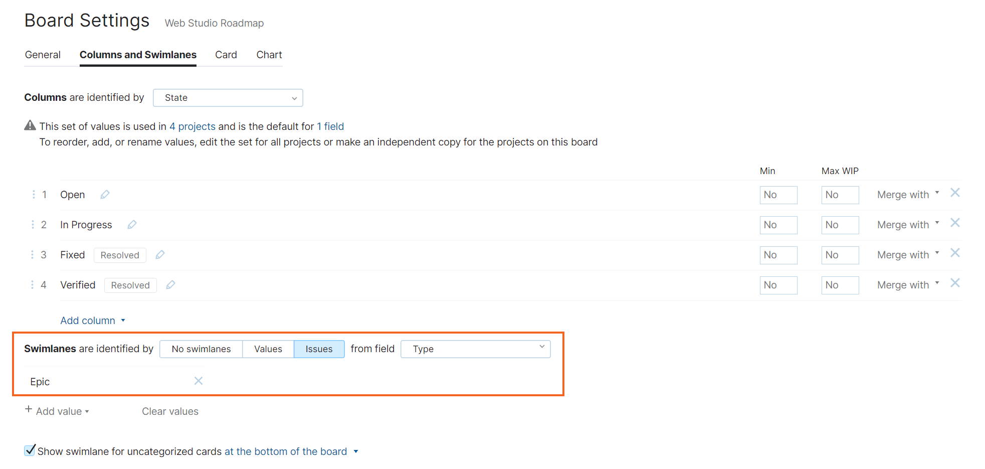 On the Columns and Swimlanes tab, update the settings to identify swimlanes by issues from the Type field and use Epic.