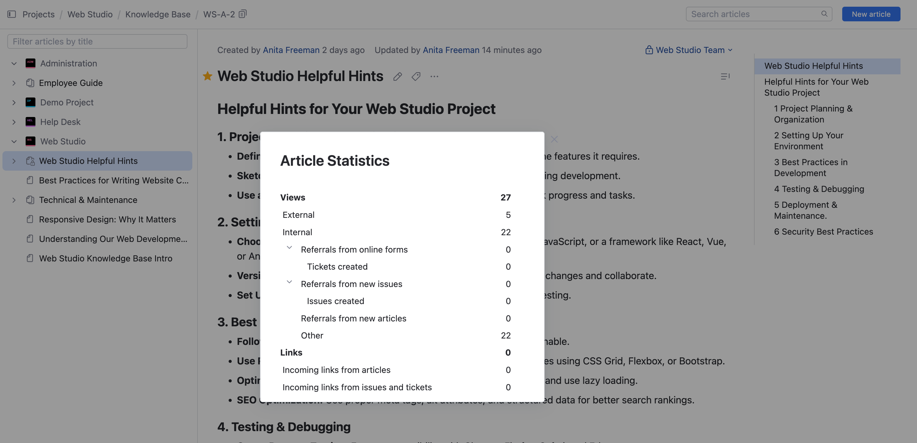 Article statistics let you track how many people are viewing and linking to content in your knowledge base. This feature can help you determine how well your content is performing. You can also measure whether your content is addressing your readers' needs based on the number of issues and helpdesk tickets were created by people even after they visited an article.