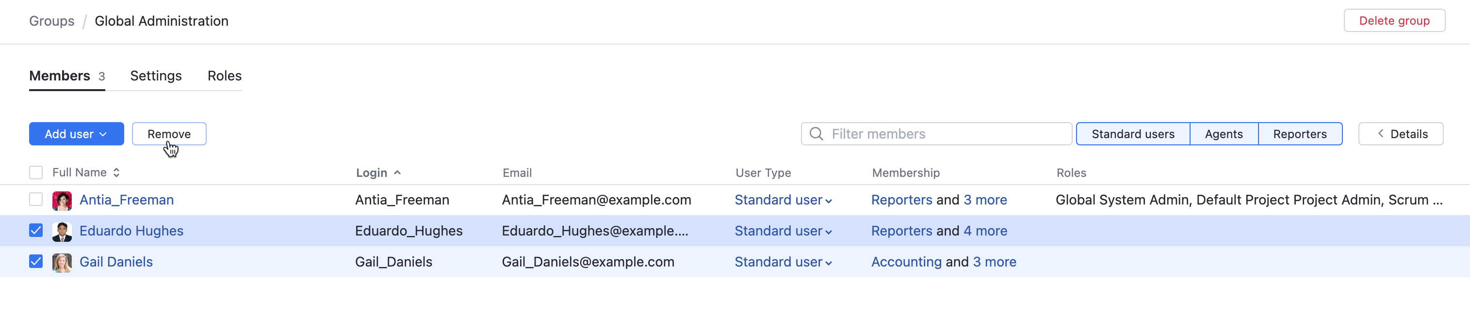 You can remove user accounts from a group. Any access permissions that are granted to this group are revoked from the user accounts.