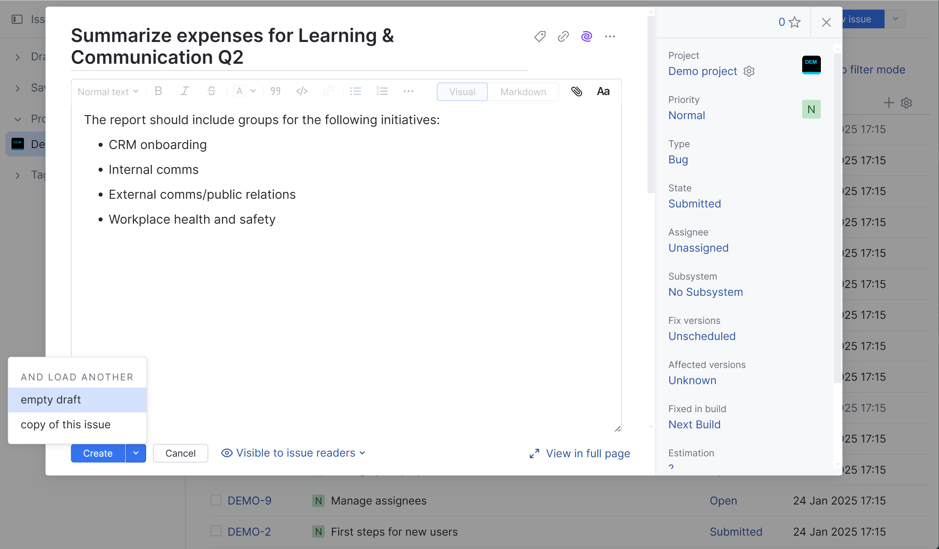Enter an issue summary and description in the corresponding input fields. When you enter the description, you can format your text in Visual or Markdown mode.