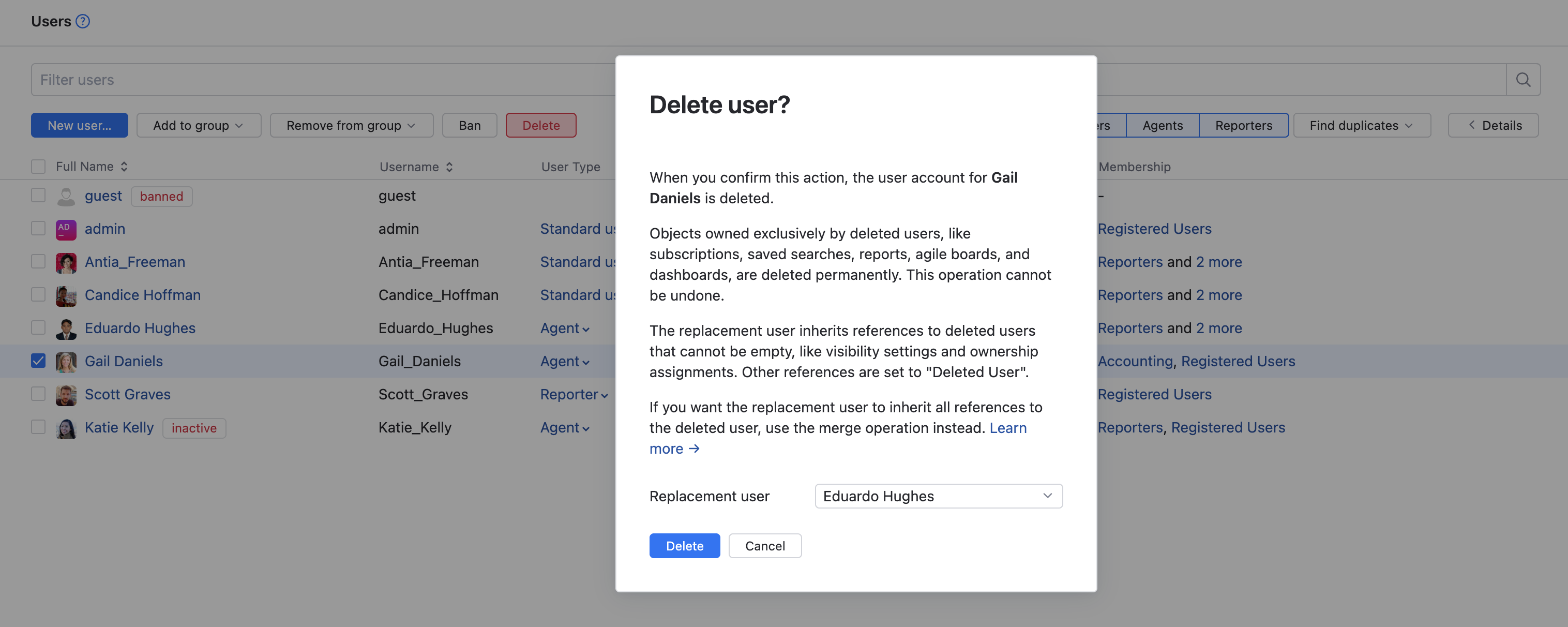 The replacement user inherits ownership for shared tags, saved searches, reports, and agile boards that were set to the deleted users.