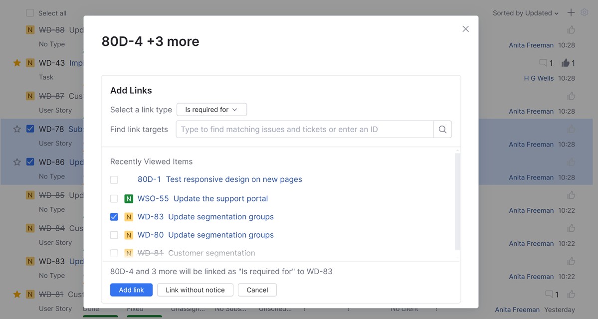 • Link multiple issues at once by selecting each issue to link and clicking the Link issue button.