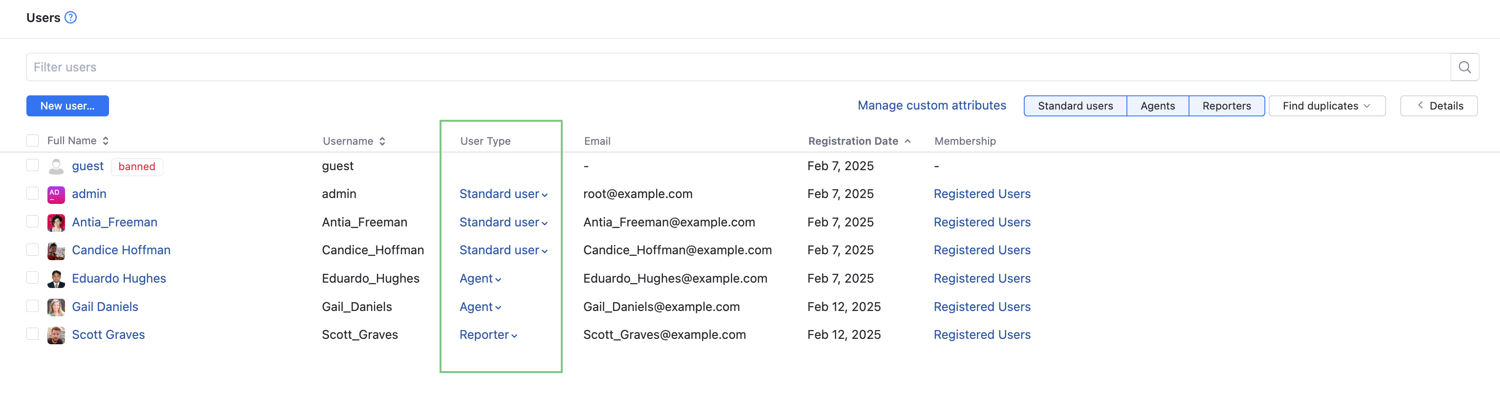 There are three user types in YouTrack: standard users, agents, and reporters.