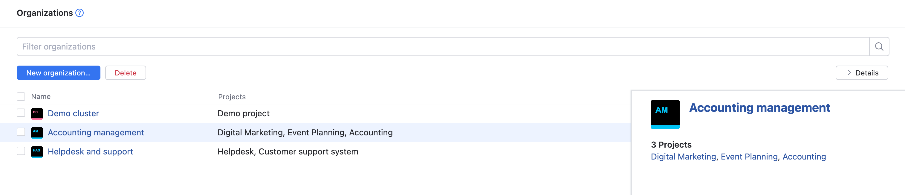 To access the list of organizations in YouTrack, select Organizations from the Access Management section of the Administration menu.