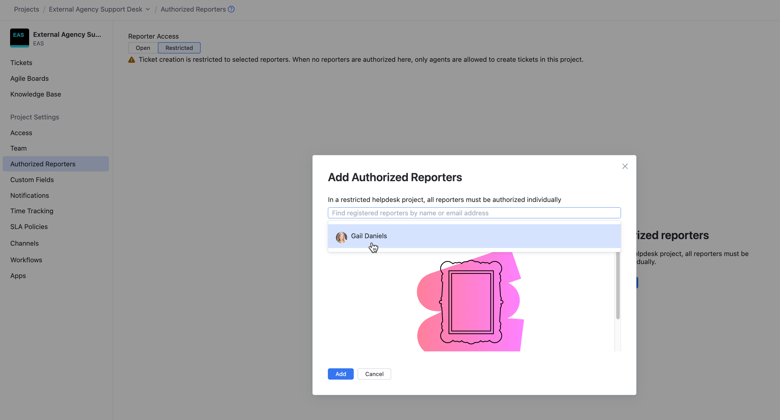 6. Select reports from the drop-down list and click Add to allow access to the restricted helpdesk project.