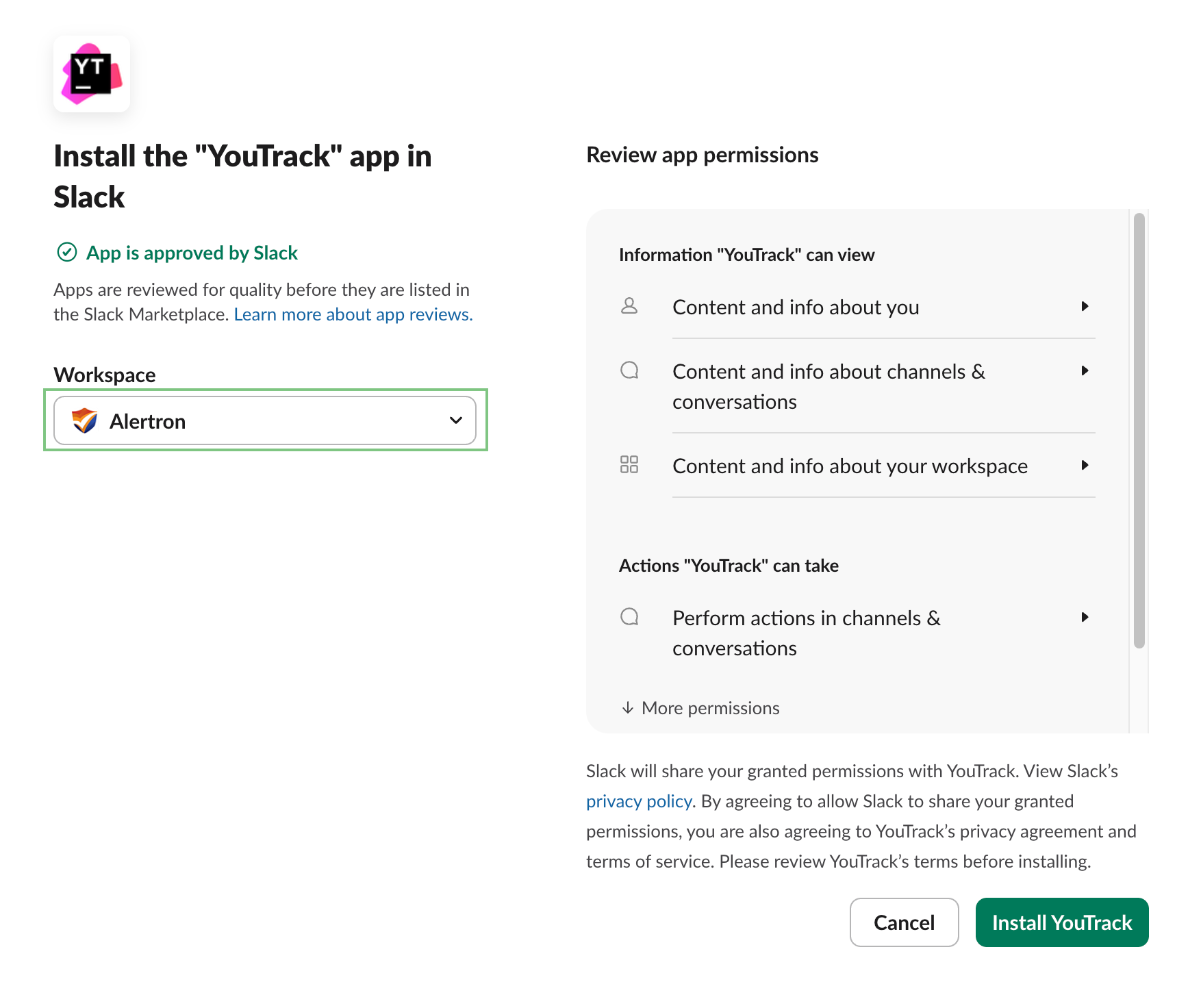Review the list of permissions that the YouTrack app requires from Slack, then click the Install YouTrack button.