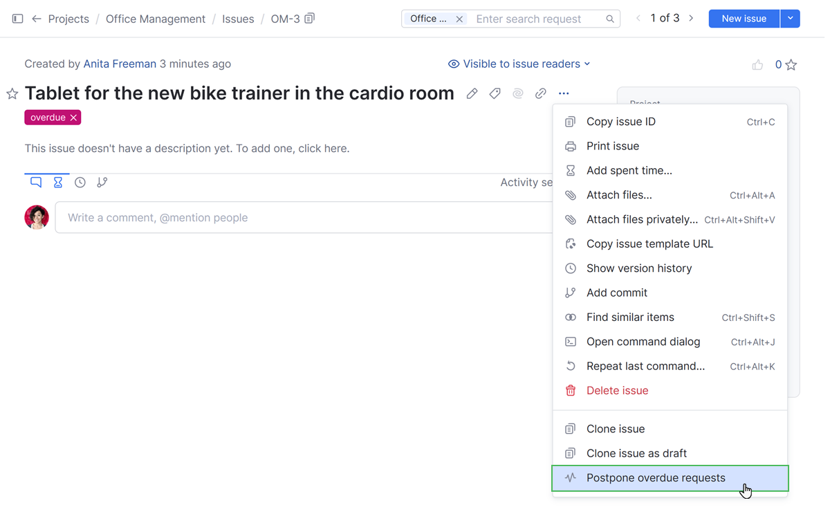 • When the person who is responsible for purchase requests needs more time to investigate the issue, they can automatically postpone the due date for another week and add a comment by applying a single command.