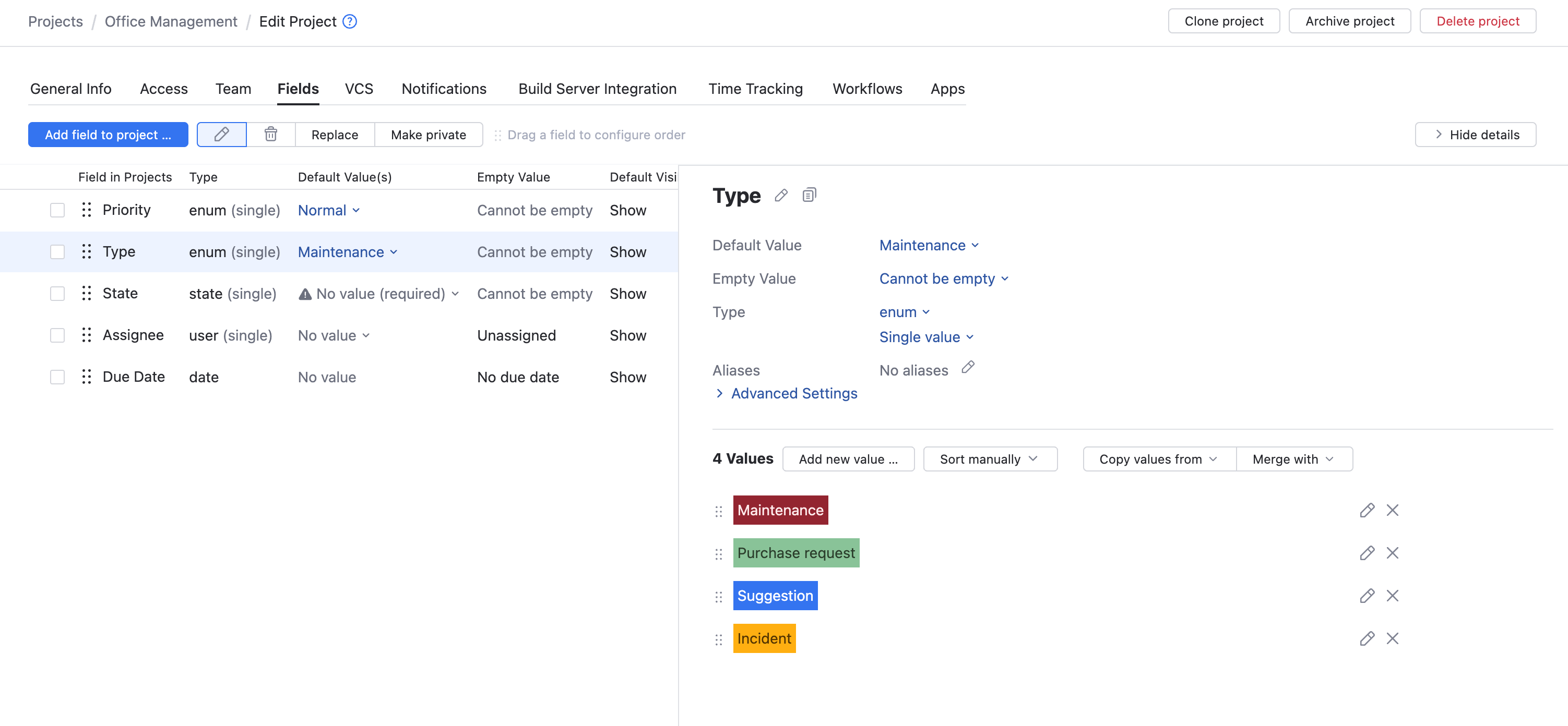 For this scenario, let's assume that you have a project named Office Management. This project uses the following issue fields: