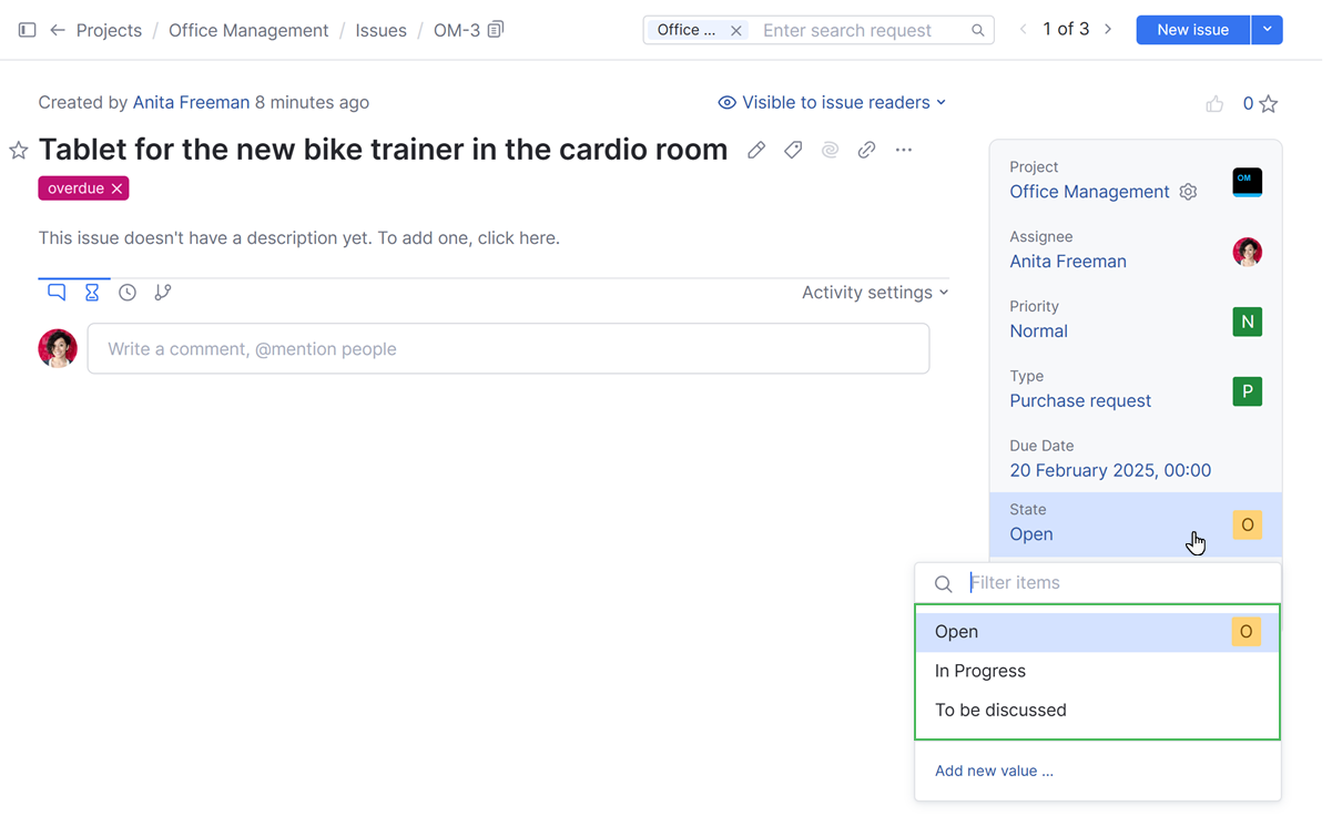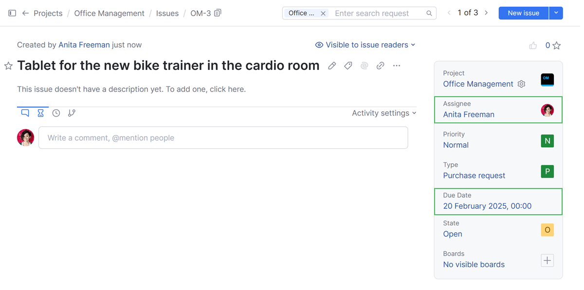 • Any time a new purchase request is created in the Office Management project, it is automatically assigned to the person who is responsible for handling this type of request. The same logic applies to an existing issue that is assigned the Purchase request type.