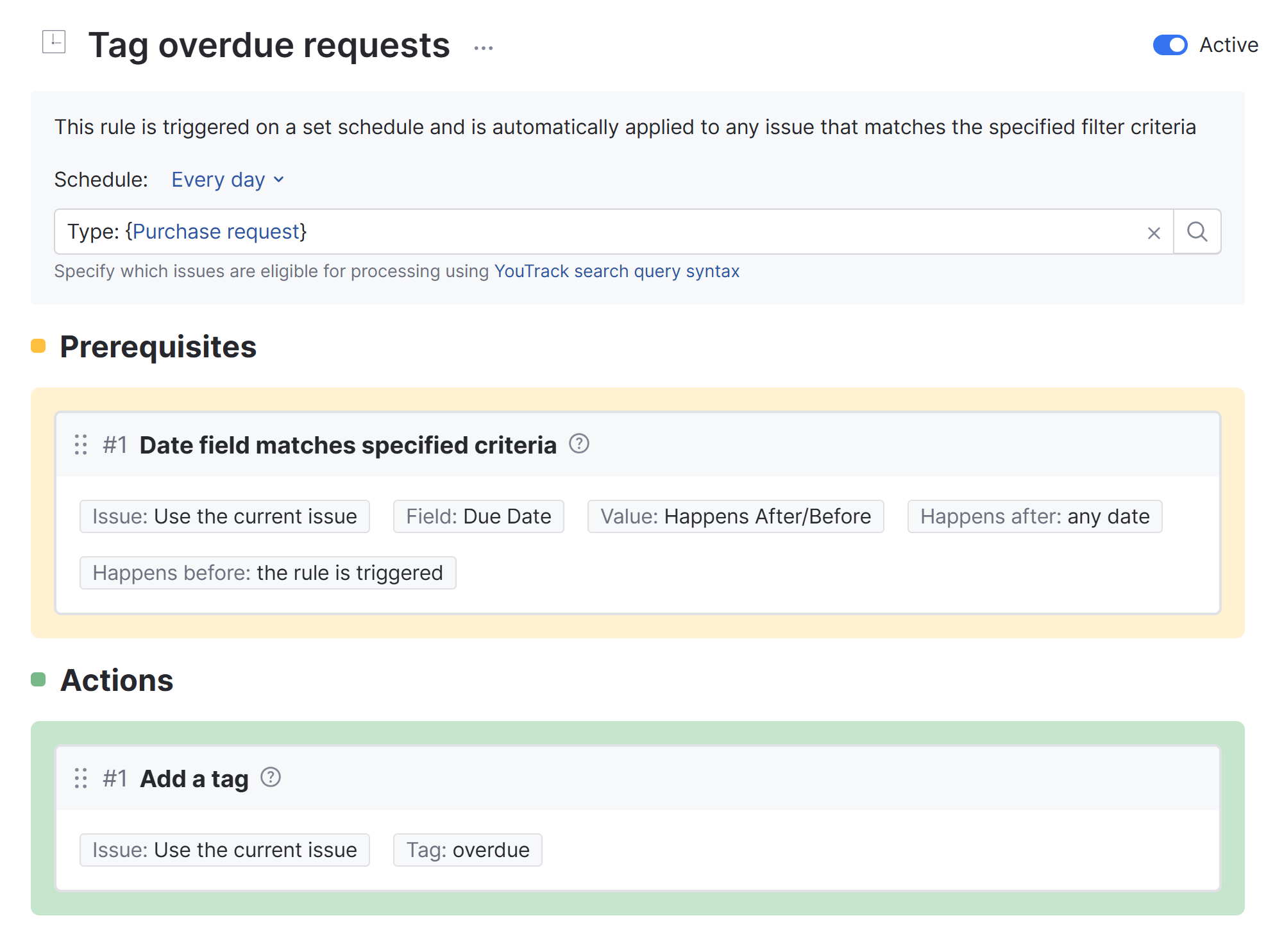 • The rule is active and will update and tag overdue issues in the selected project on a daily basis.
