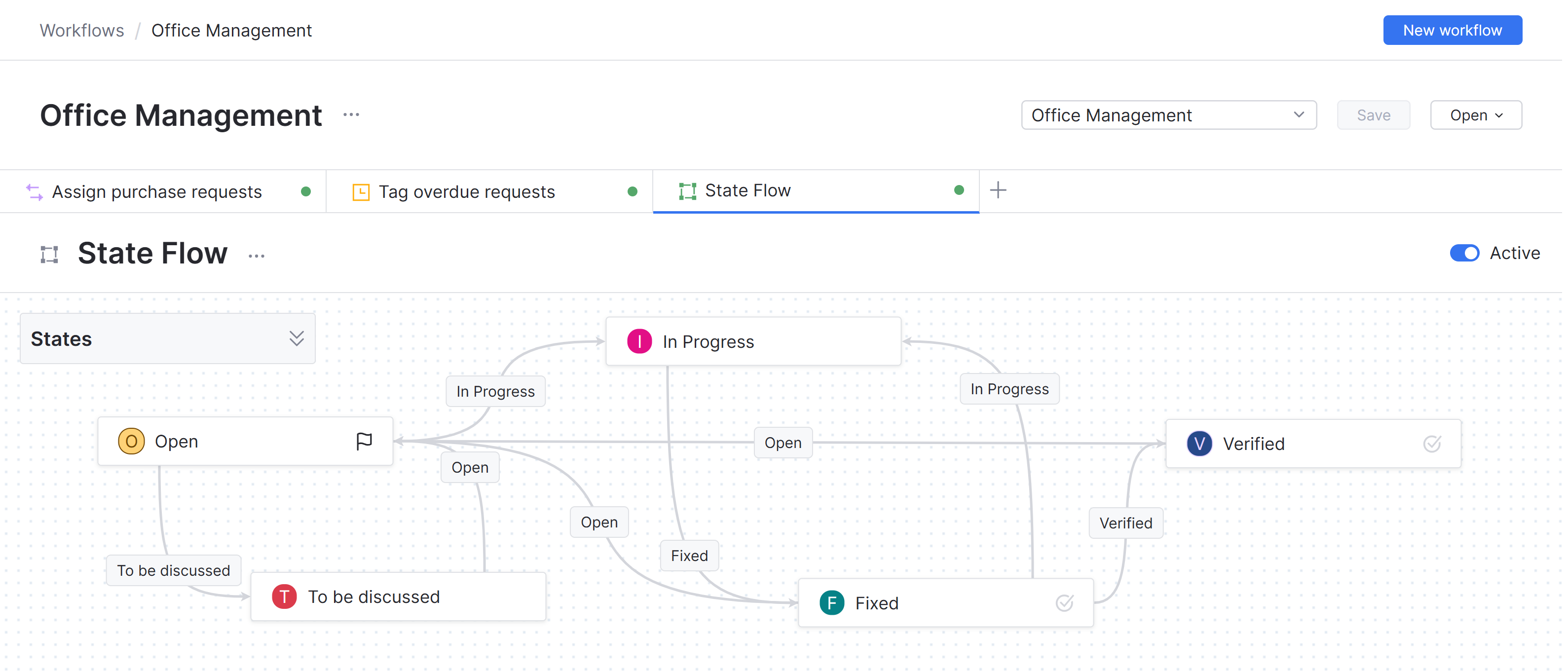 • A transition from the Open to the In progress state is added.