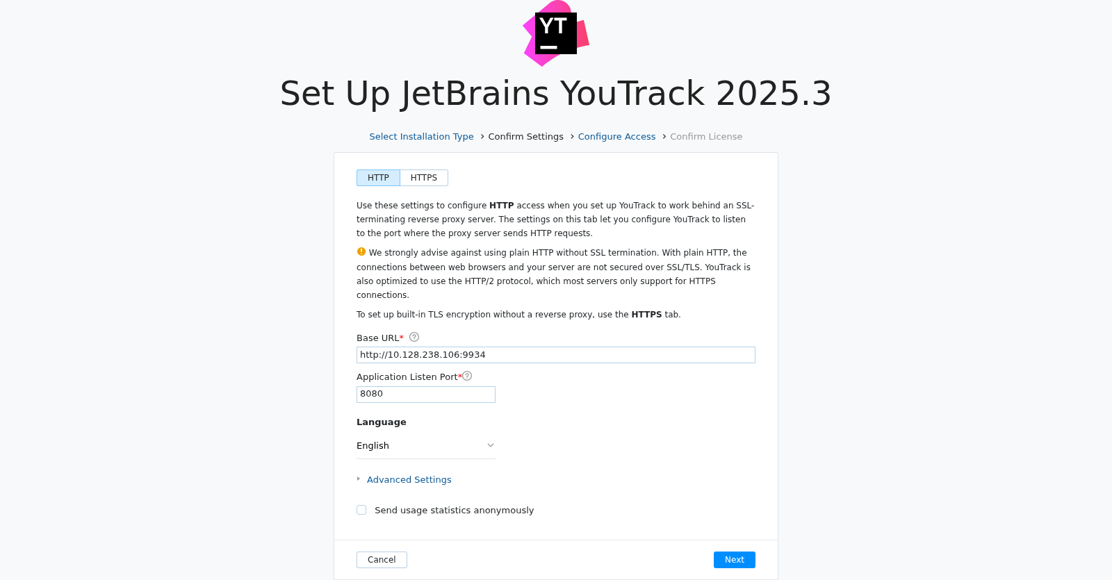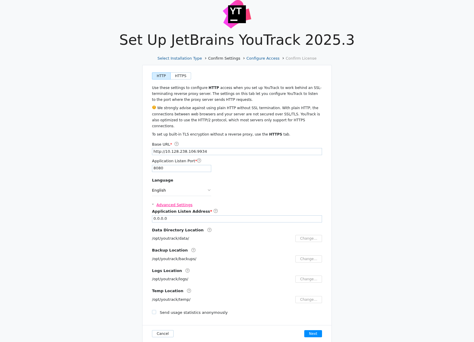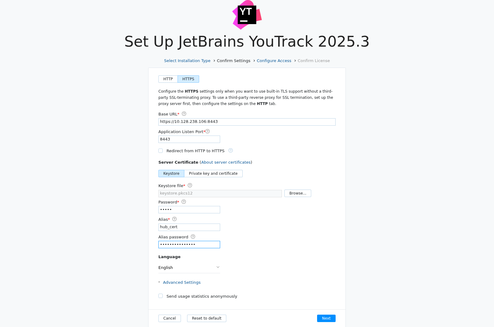 4. To share usage statistics with JetBrains, keep the Send usage statistics anonymously option enabled. This feature helps JetBrains track usage statistics to make YouTrack Server better. We never share collected data with any third party.