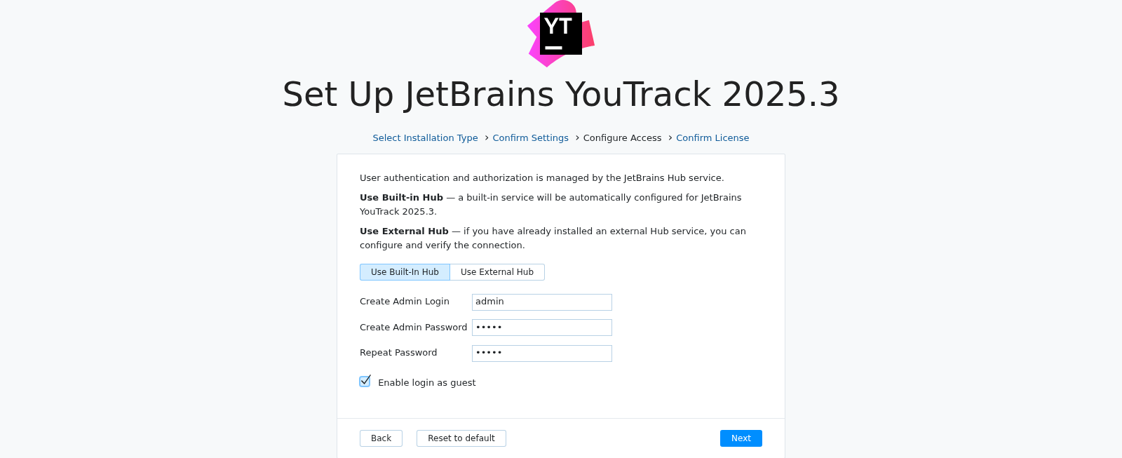 On the first run, the YouTrack service starts with a web-based Configuration Wizard. The wizard is accessible from the web address where the service is hosted.