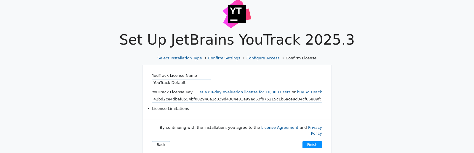 At this point, the application is installed with the default configuration. To ensure that YouTrack is set up properly to work in your server environment, you need to confirm and fine-tune its configuration.