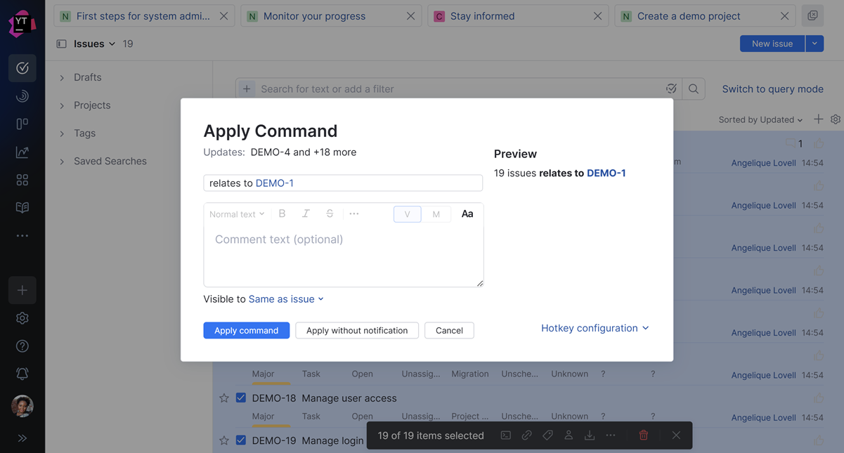 As part of this revamp, we were able to implement and improve several features used by everyone in YouTrack. These include: