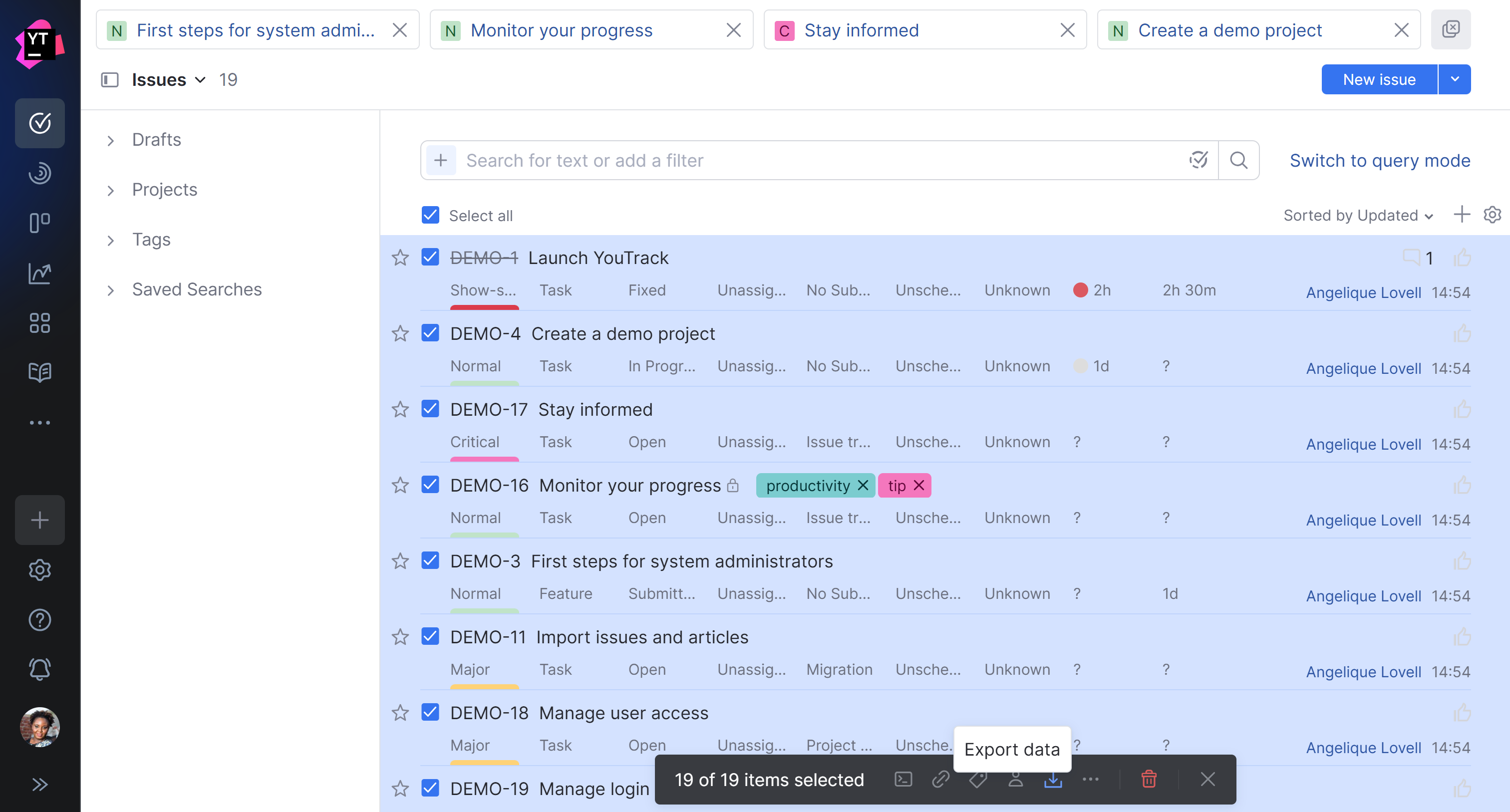 Issue data export | Allowing everyone to select multiple issues in the list gave us the ability to let you export data for selected issues as well. ![]() To learn more about this feature, see Export Issue Data. |