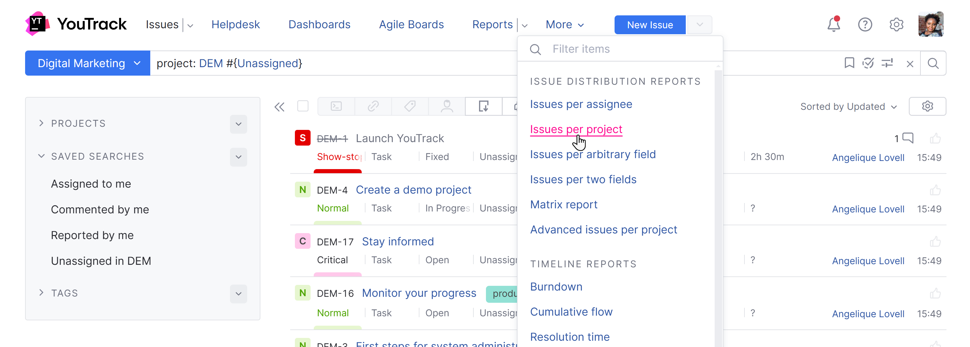 Generating reports directly from the list of issues | In the previous versions of YouTrack, there was an option to create a report directly from the list of issues using the current search criteria as the filter. Statistical usage data showed that it was rarely used, likely because it didn’t offer a meaningful time-saving advantage. ![]() Users who relied on this option will need to copy their search queries manually when creating new reports. |