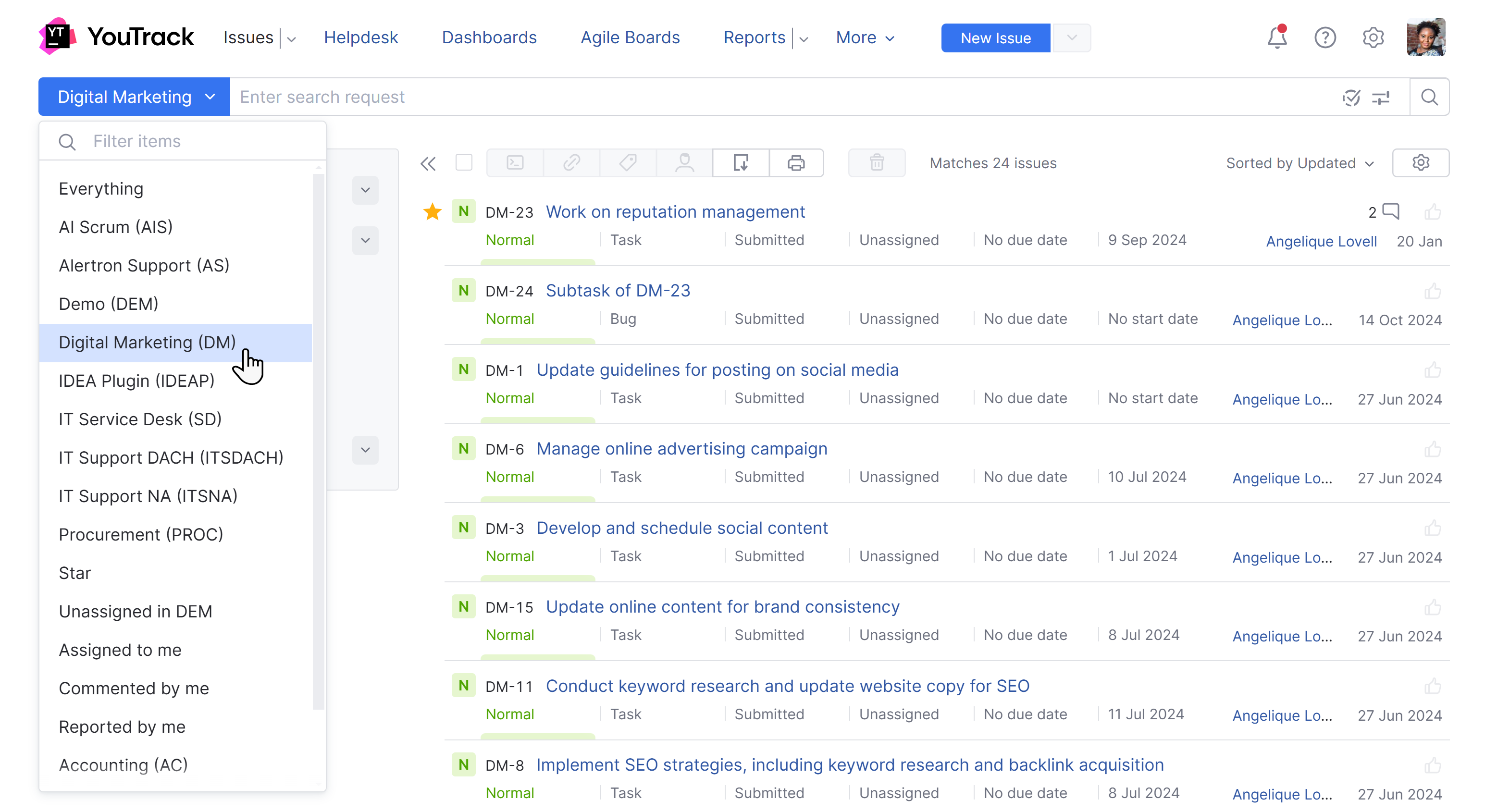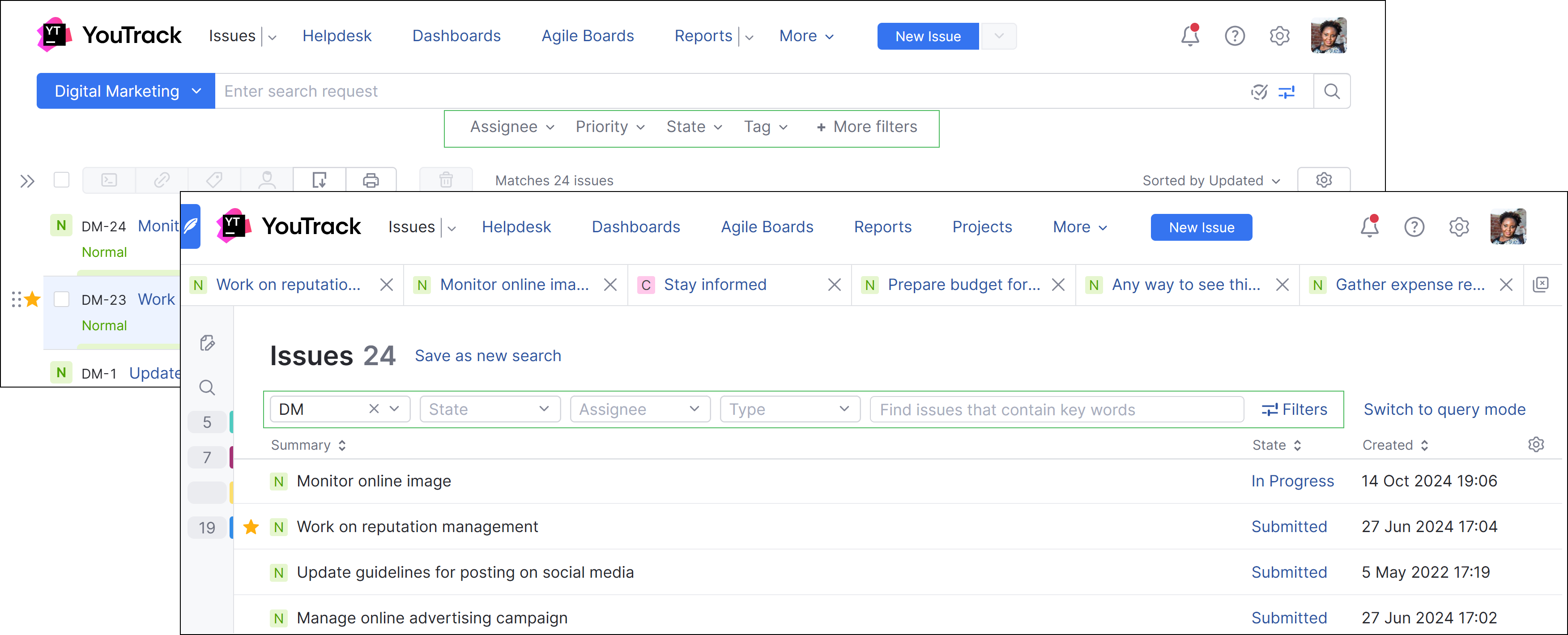 Dynamic filters | In previous versions, you had one option for filtering issue in YouTrack Classic and another filtering scheme in YouTrack Lite. For YouTrack 2025, we've replaced both approaches with a single, dynamic tool for filtering the list of issues.