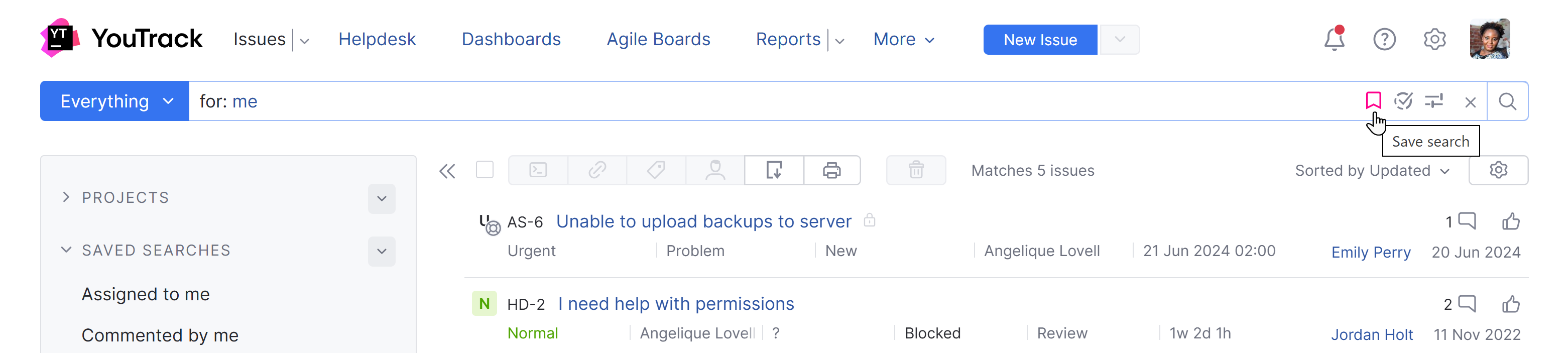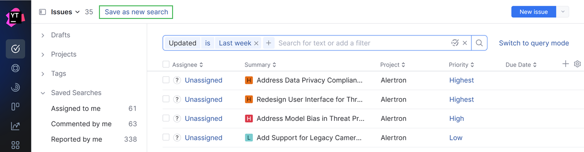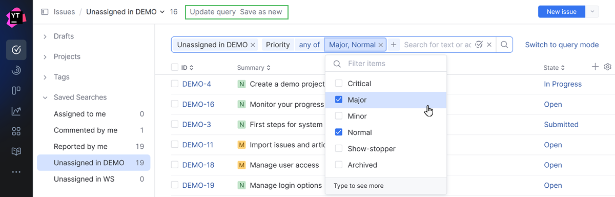 Streamlined creation and update for saved searches | In older YouTrack versions, you could create a new saved search by clicking the ![]() In the new UI, the option to save a new search query is shown whenever you filter the list or enter a search request. ![]() When you open a saved search and modify the search criteria, you can either save the changes as a new search or update the existing saved search. ![]() |