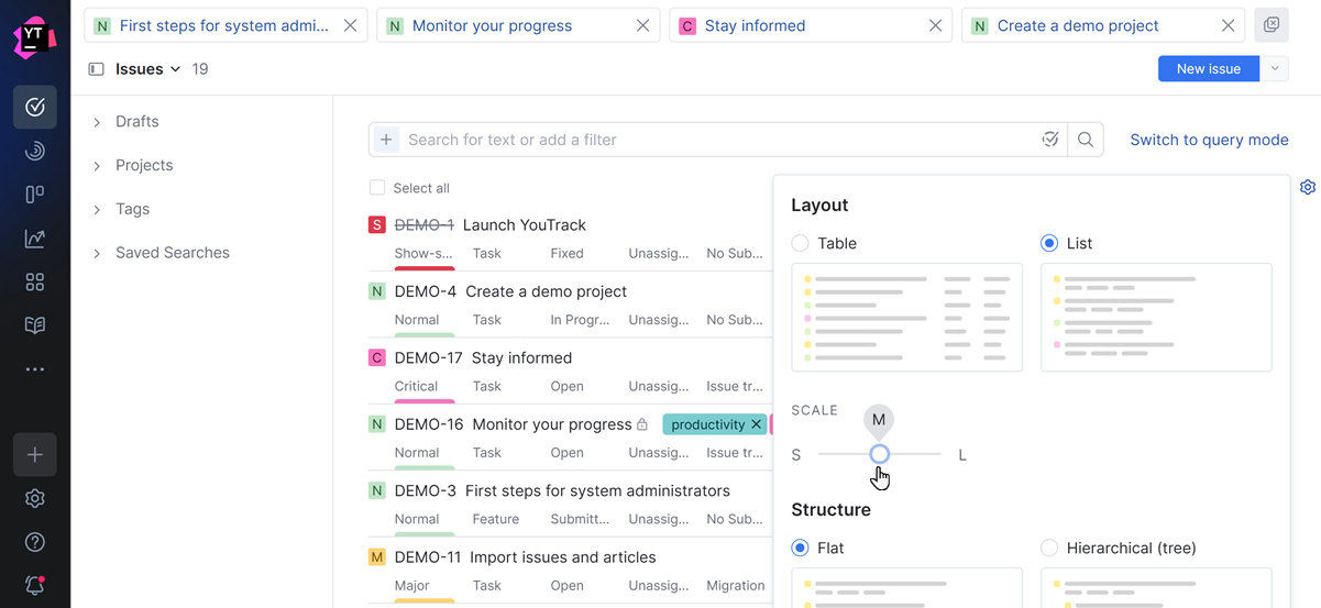 View modes | The layout for issues in YouTrack Lite displayed a limited amount of information for each issue in the table. Now that everyone has the option to switch between a table and a list, users who were working with the Lite UI have access to an additional Scale setting. ![]() When working with the Layout set to List, use this option to manage the level of detail in the list. |