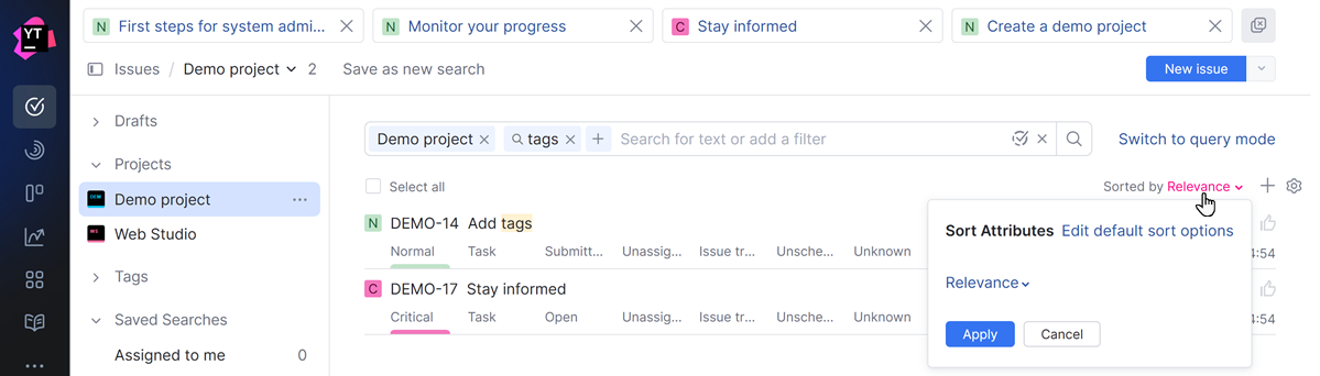 Sorting by relevance | YouTrack Classic users had the option to sort search results by relevance. This option lets you see issues based on the number of times they contain matching keywords. With the latest update, this feature is available to anyone who works with issues with the Layout set to List. ![]() |