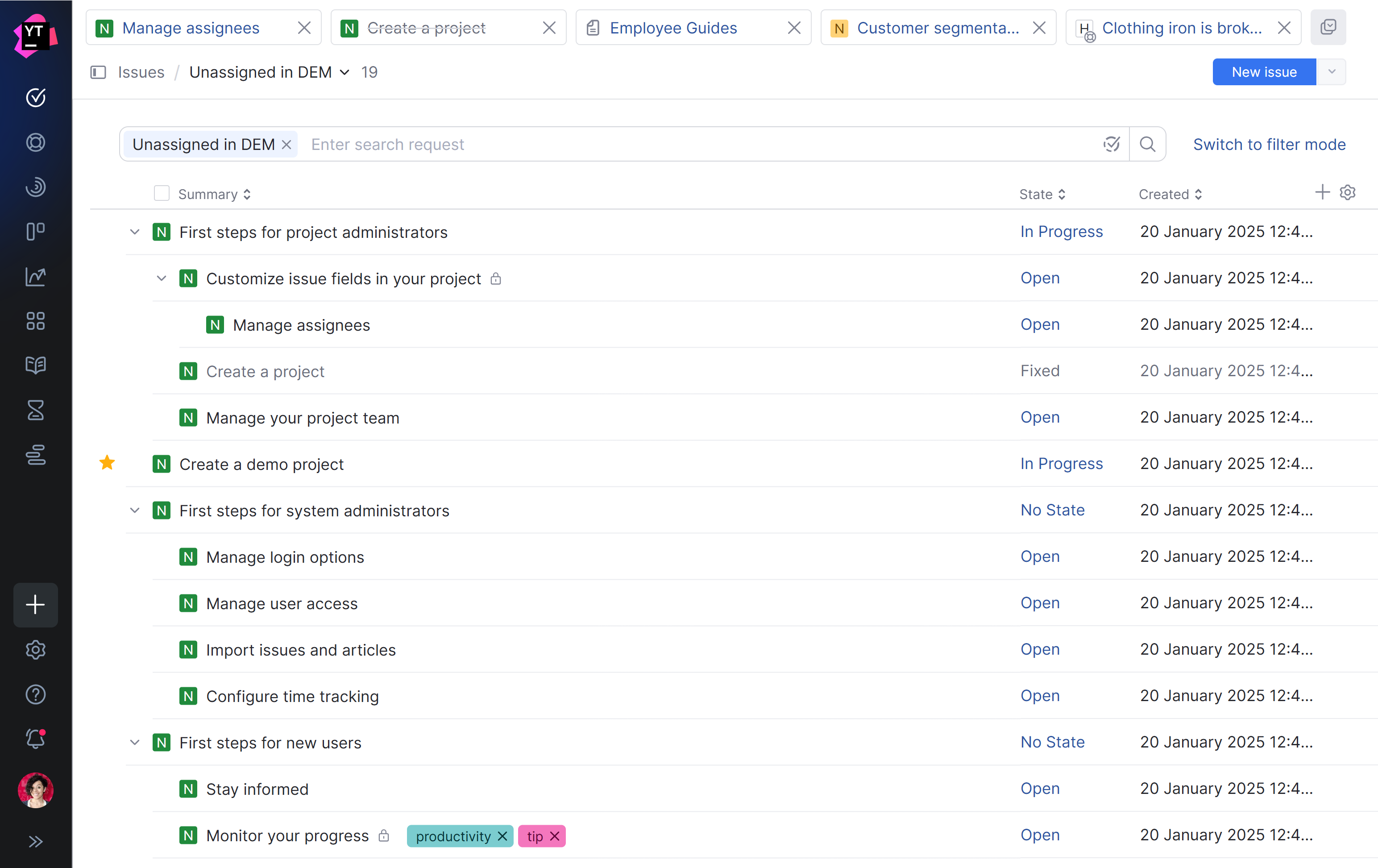 Tree view | The ability to view the list of issues as a hierarchical tree was previously exclusive to YouTrack Classic. With this update, you have the option to switch between a flat list and tree view. ![]() To learn more about this feature, see Structure. |