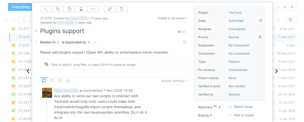 Modal popup for issue previews | YouTrack Classic supported two modes for previewing issues in the list: an inline preview to expand single issues and a modal popup. Now that we introduced the option to switch between inline previews and the sidebar preview panel, we've removed the modal popup. ![]() If you were comfortable with the modal preview, we suggest switching to the Sidebar option. |