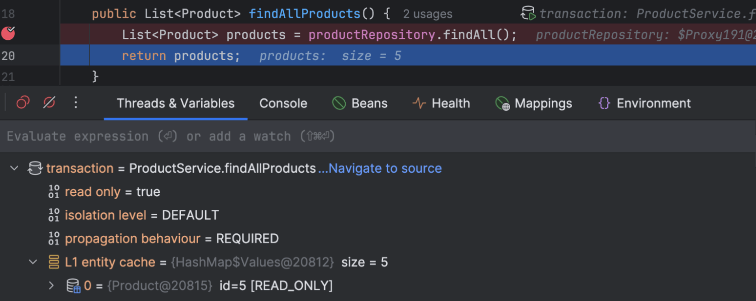 IntelliJ IDEA shows active transactions directly in your code and the Debugger tool window, including isolation levels and propagation.