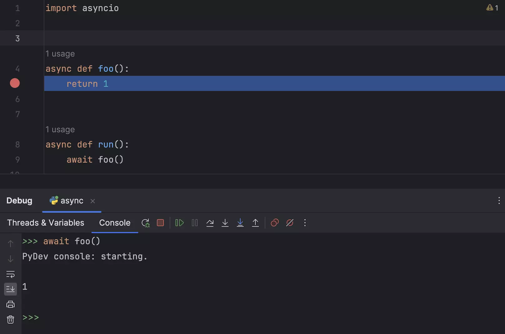 PyCharm でデバッグしながらプログラムの状態に関する情報を簡単に取得し、コルーチンの評価を追跡できるようになりました。 IDE がデバッグコンソールの関数の外で直接 await キーワードの使用を受け入れるようになりました。 Evaluate Expression(式の評価)ダイアログ、ウォッチリスト、Breakpoint evaluate and log(ブレークポイントの評価とログ)および Breakpoint condition(ブレークポイントの条件)プロパティをセットアップする際にコルーチンと await キーワードを使用できるようになりました。