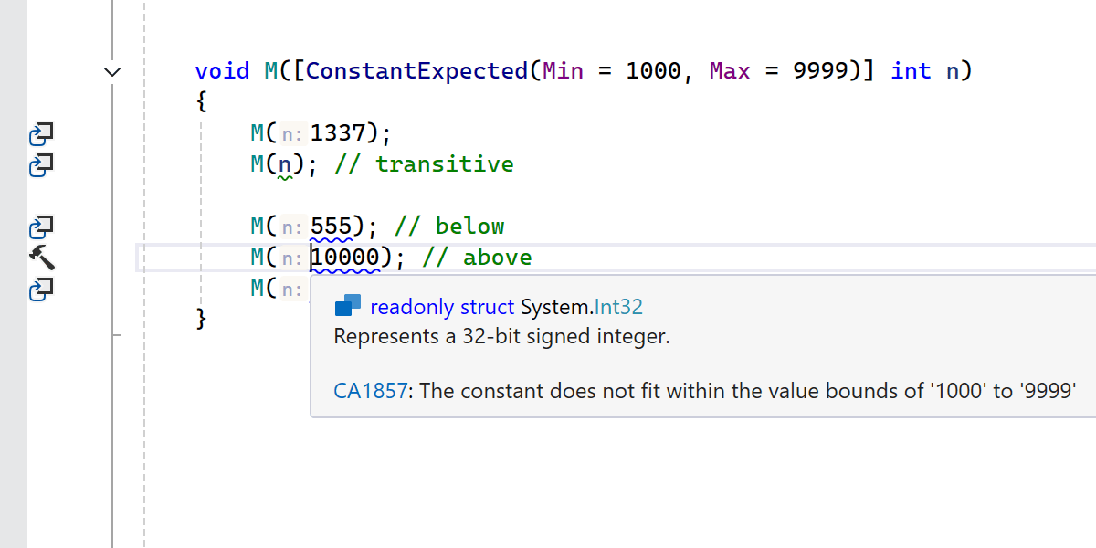 ConstantExpected 属性のサポート ReSharper が [ConstantExpected] 属性が指定されているパラメーターに定数でない値が渡される場合に警告を示し、捉えにくいバグを回避しやすくします。