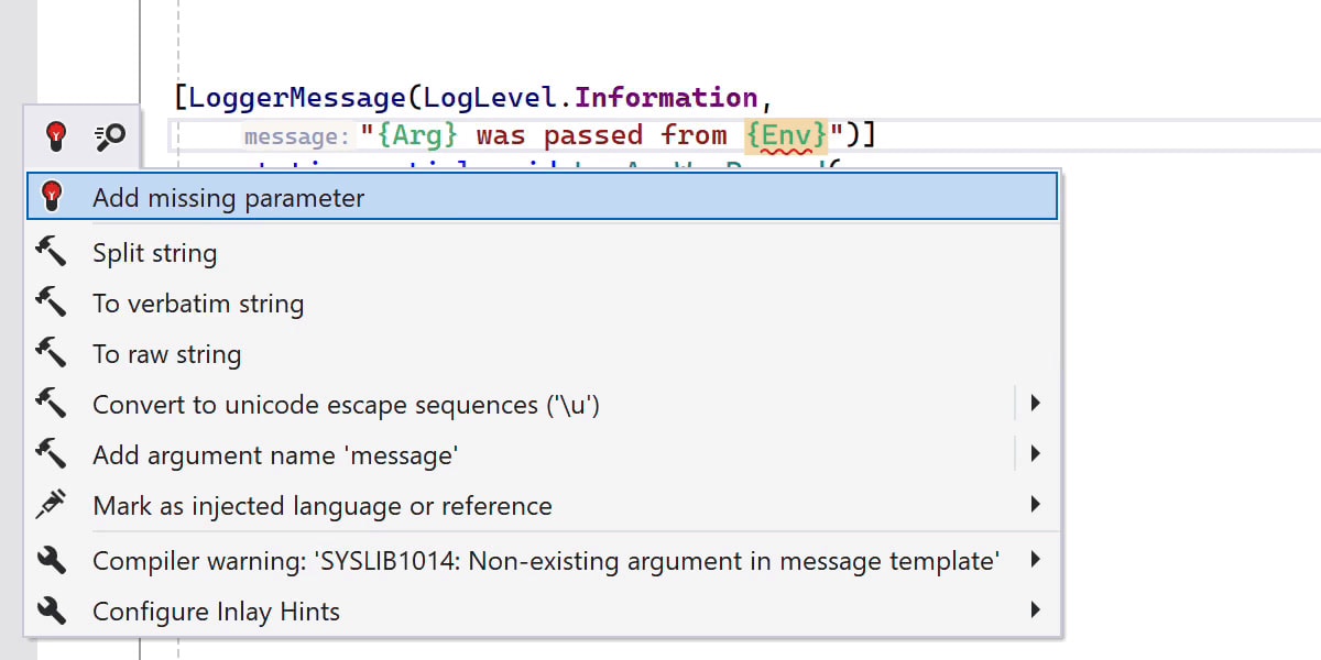 [LoggerMessage] 属性パラメーター名の処理の改善 ReSharper が [LoggerMessage] 属性のパラメーター名を補完する便利な機能を提供し、対応するパラメーター名が変更された際にコードを正しく更新できるようになりました。